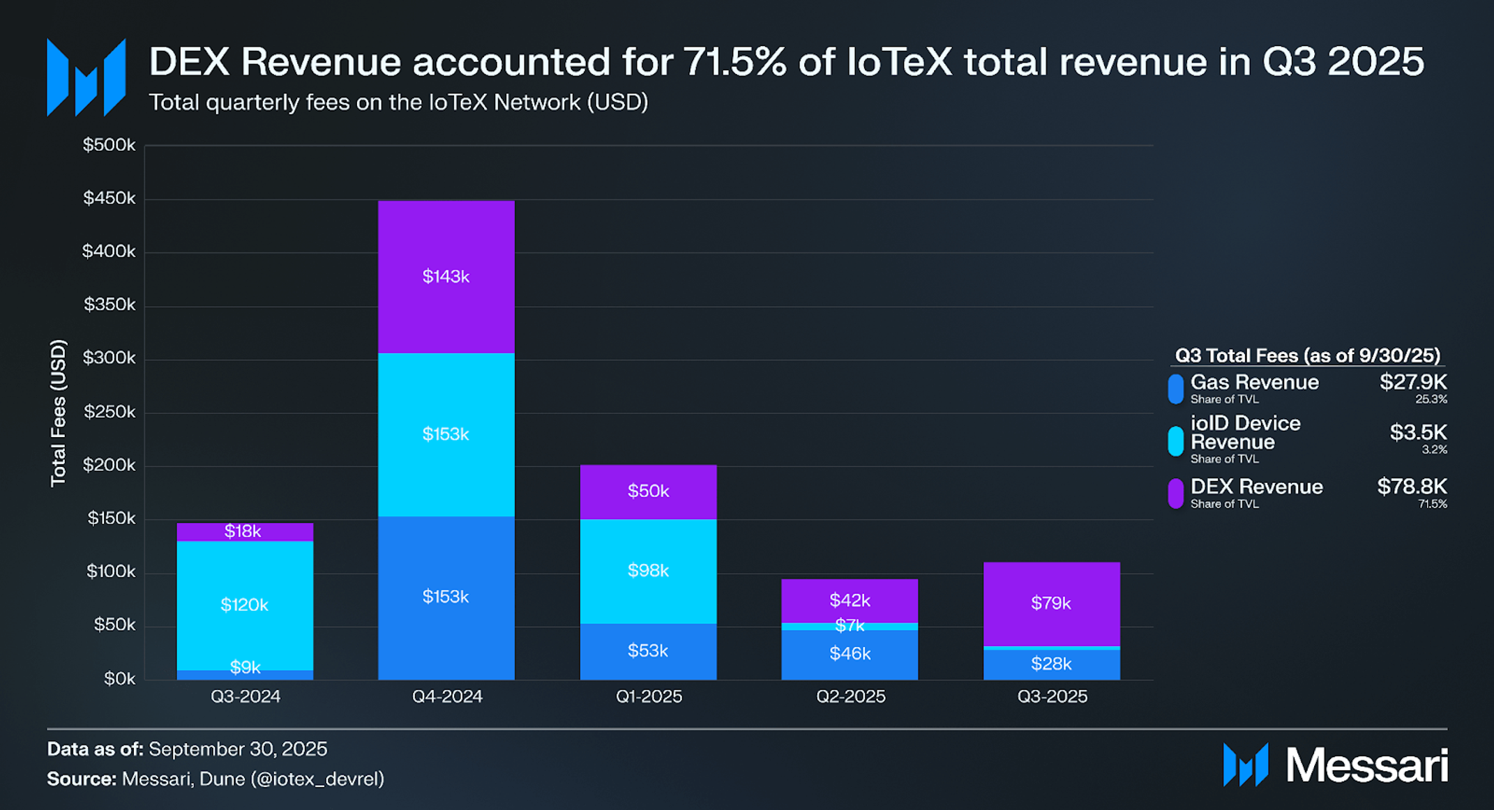 IoTeX의 프로토콜 수익은 2025년 3분기 전 분기 대비 16.2% 증가해 11만 200달러를 기록했으며, 2분기 하락에서 반등했다. 상승은 주로 총 수익의 71.5%를 차지한 DEX 수익이 주도했으며, 지난 1년 동안 DEX 활동이 프로토콜 수익의 대부분을 차지한 첫 번째 사례를 기록했다. 가스 수익은 전 분기 대비 40% 감소해 4만 6,344달러에서 2만 7,886달러로 하락했으며, ioID 기기 활성화 수익도 전 분기 대비 49% 감소해 6,921달러에서 3,504달러로 떨어졌다. 이러한 감소는 DEX 수익의 90% 증가로 상쇄됐으며, 2분기 4만 1,554달러에서 3분기 7만 8,830달러로 상승했다.