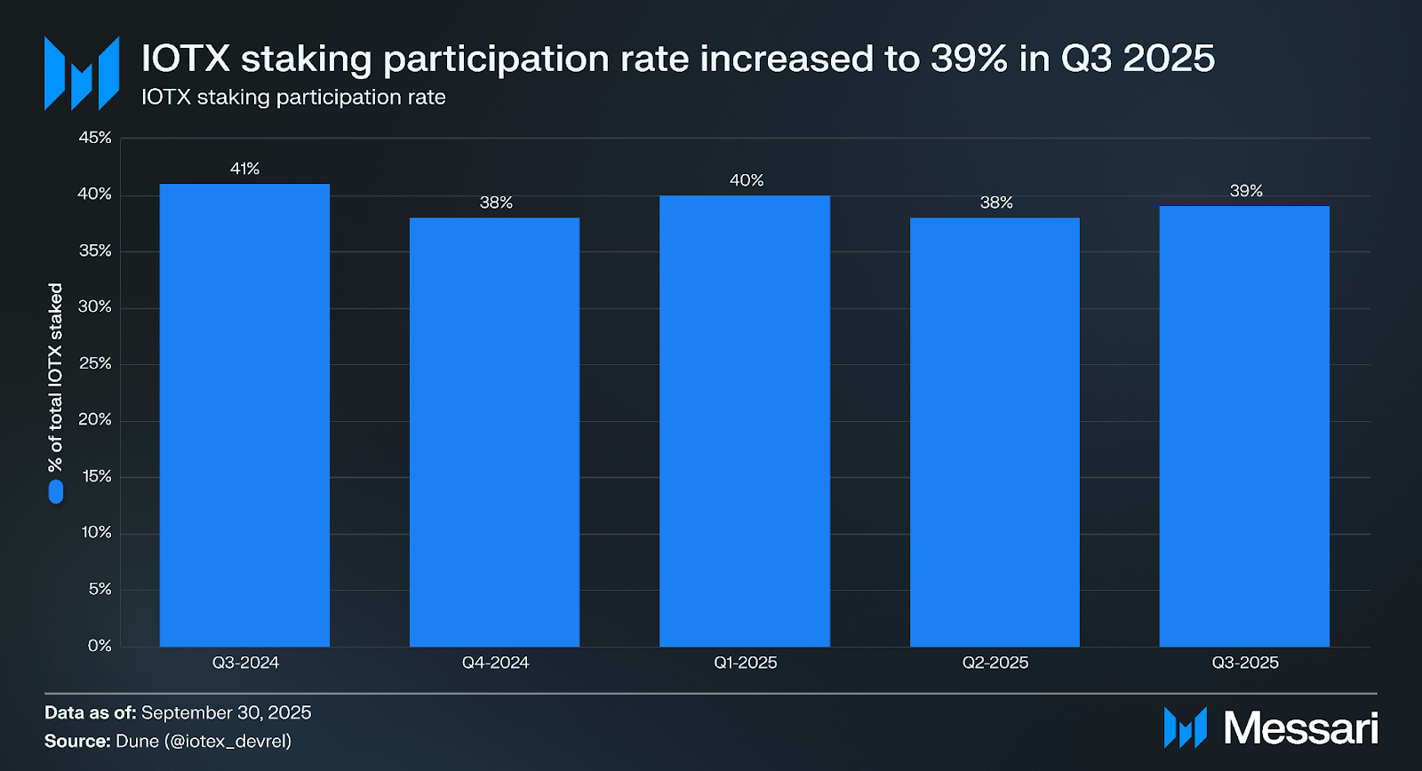 재무적으로 프로토콜 수익은 전 분기 대비 16.2% 반등해 11만 200달러를 기록했으며, DEX 수익의 90% 증가가 주도했다. DEX 수익은 가스 및 ioID 관련 수수료를 제치고 네트워크에서 가치의 주요 동력이 됐다. 한편 스테이킹 활동은 꾸준히 유지됐으며, 36억 IOTX가 스테이킹됐고 애니모카 브랜즈, IoTeXLab, 바이낸스 스테이킹이 선도 대표 위치를 유지했다.