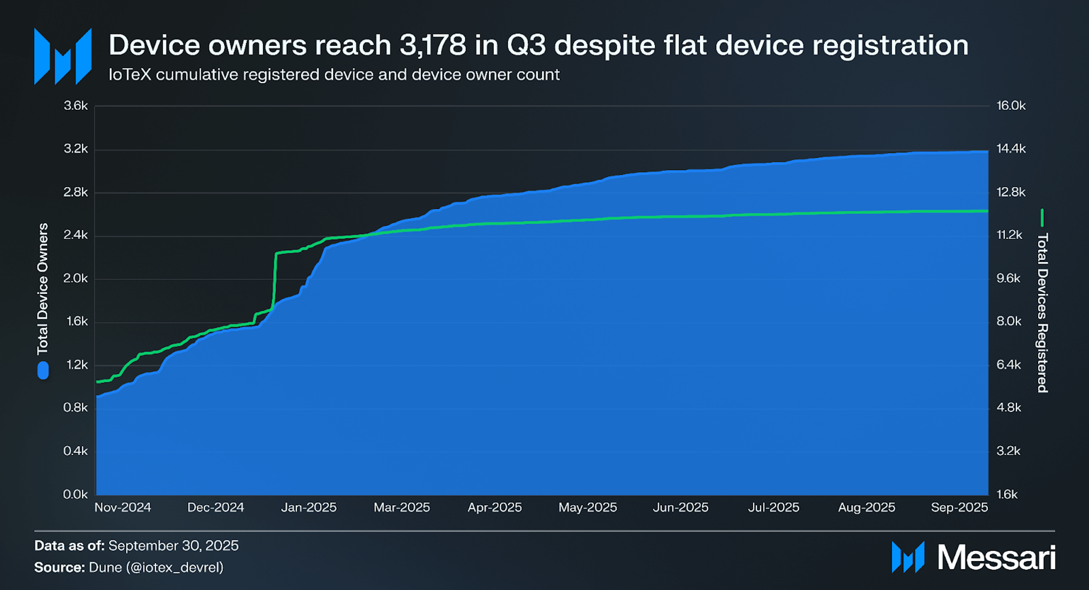2025년 3분기 IoTeX 네트워크는 사용량, 인프라, 기관 포지셔닝 전반에 걸쳐 지속적인 성숙도를 보여줬다. 평균 일일 거래와 활성 지갑이 전 분기 대비 소폭 감소했지만, ioID 이후 급격한 급등 이후 활동이 정상화되어 안정화된 사용자 기반과 지속적인 애플리케이션 참여를 나타냈다. 특히 130개 이상의 애플리케이션이 이제 실물 기기 데이터 및 오프체인 계산을 위해 IoTeX L1에 의존하며, 탈중앙화 물리 인프라(DePIN)에서 네트워크의 역할을 고정한다.