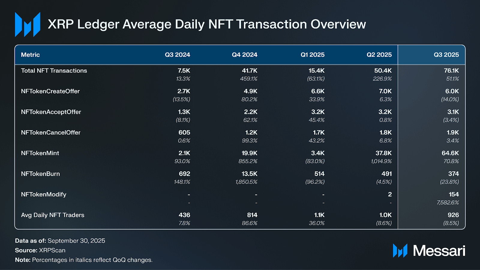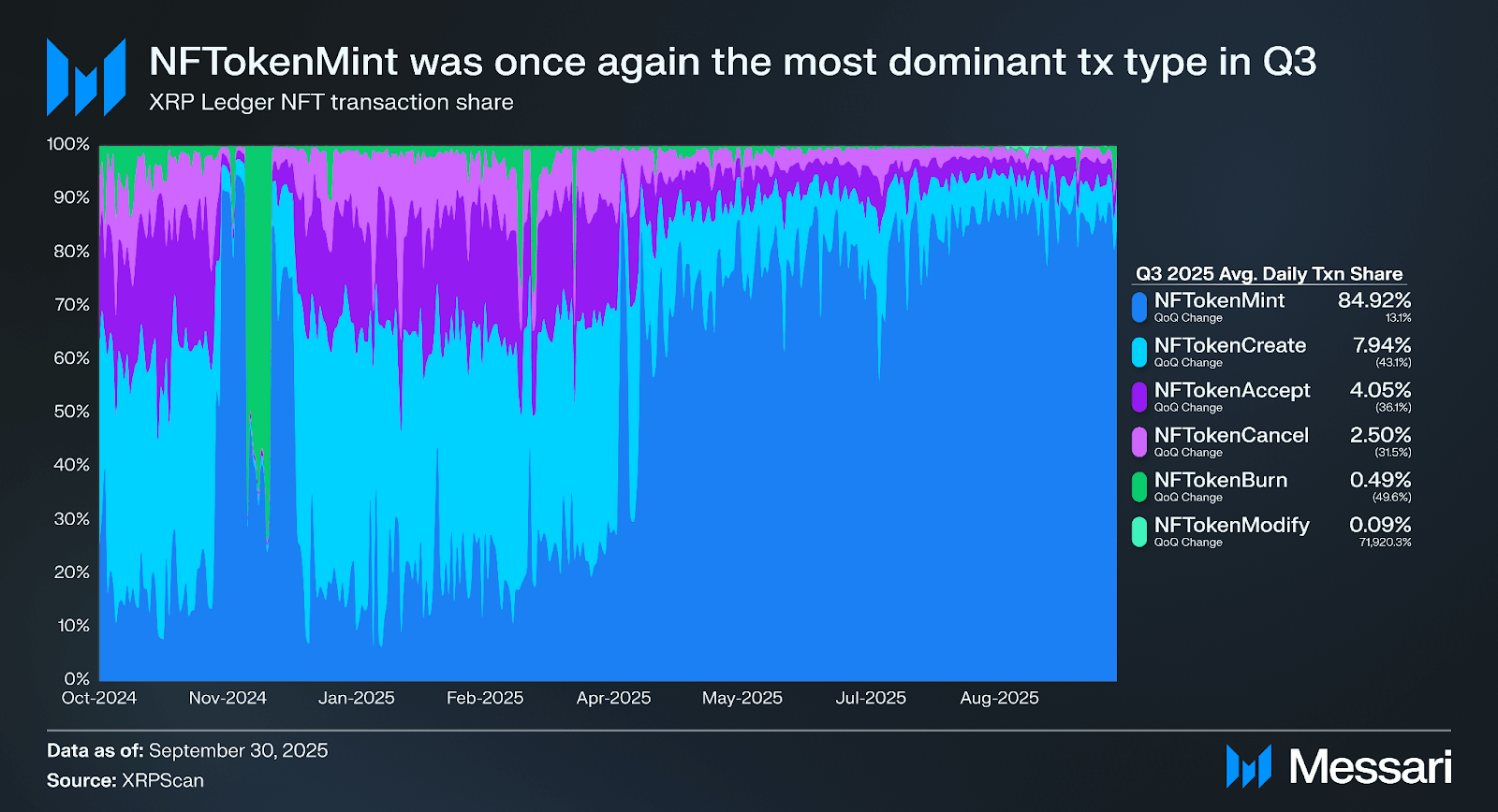 2분기와 마찬가지로, NFTokenMint는 2025년 3분기에 가장 일반적인 거래 유형이었다. 3분기 말 기준, XLS-20 표준으로 약 1770만 개의 NFT가 민팅되었다. 특히, 이 중 420만 개가 3분기 2025에, 340만 개가 2분기 2025에 민팅되었다.