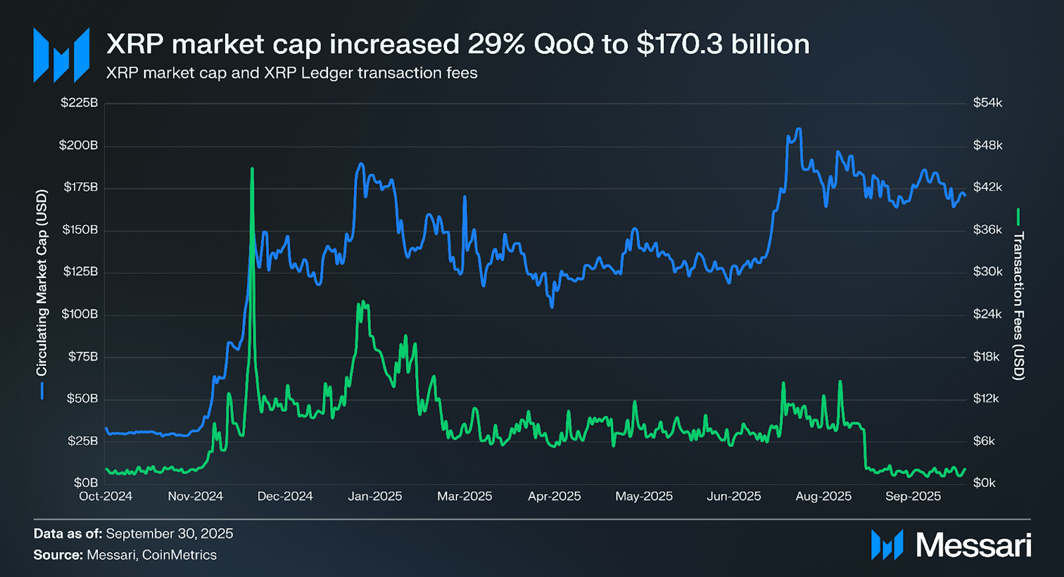 XRP는 시가총액 기준 4위 암호화폐 자산으로 3분기 2025를 마감했으며, 분기 사상 최고치인 1703억 달러(+29% QoQ)를 기록하여, 13.3% QoQ 증가한 비트코인, 이더리움, 솔라나의 합산 시가총액을 능가했다. XRP의 가격은 QoQ 29.0% 증가한 2.85 달러(역시 분기 사상 최고 종가)를 기록했으며, 시가총액과 가격 간의 차이는 유통 공급량의 1.4% 증가 때문이다.
