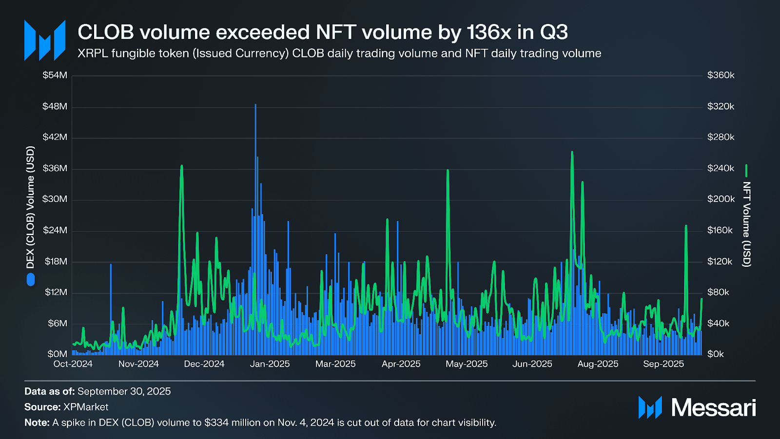3분기에 평균 일일 CLOB 거래량은 NFT 거래량을 136배 초과했으며(7억 2200만 달러 대 530만 달러), 이는 CLOB 거래량이 NFT 거래량을 최소 90배 초과한 4번째 연속 분기다. XRPL의 이러한 지속적인 추세는 대체 가능한 토큰 거래량이 NFT 거래량보다 기하급수적으로 큰 다른 주요 암호화폐 네트워크의 광범위한 추세와 일치한다.