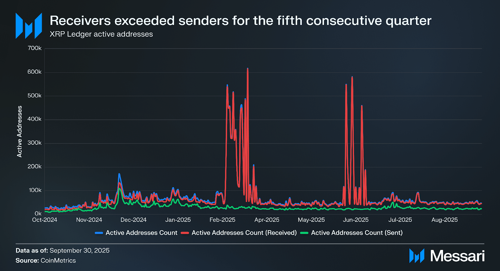 5분기 연속으로 XRPL에서 활성 수신자 주소가 활성 발신자 주소를 초과했다. 평균 일일 수신자는 QoQ 30.1% 감소하여 7만 2000에서 5만 300이 되었고, 평균 일일 발신자는 15.4% 증가하여 2만 1900에서 2만 5300이 되었다. 활성 수신자 지표는 전송 또는 기타 거래를 받는 주소 수로 결정된다. 수신자가 발신자를 앞지를 때, 이는 발신자가 토큰을 분배하는 것보다 이전에 비활성 상태였던 지갑이 발신자로부터 분배된 토큰을 받는 경우가 더 많다는 것을 나타낸다.