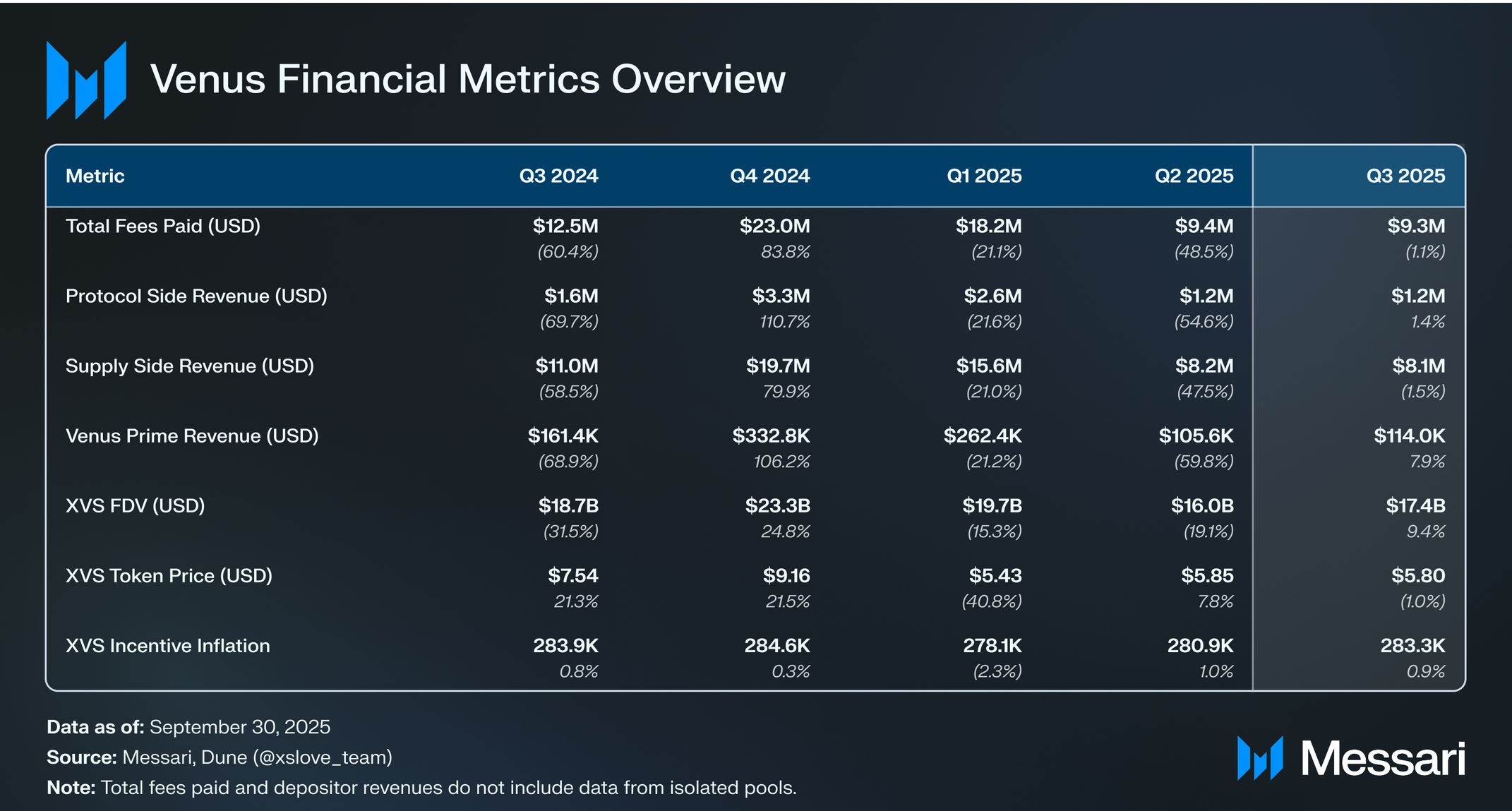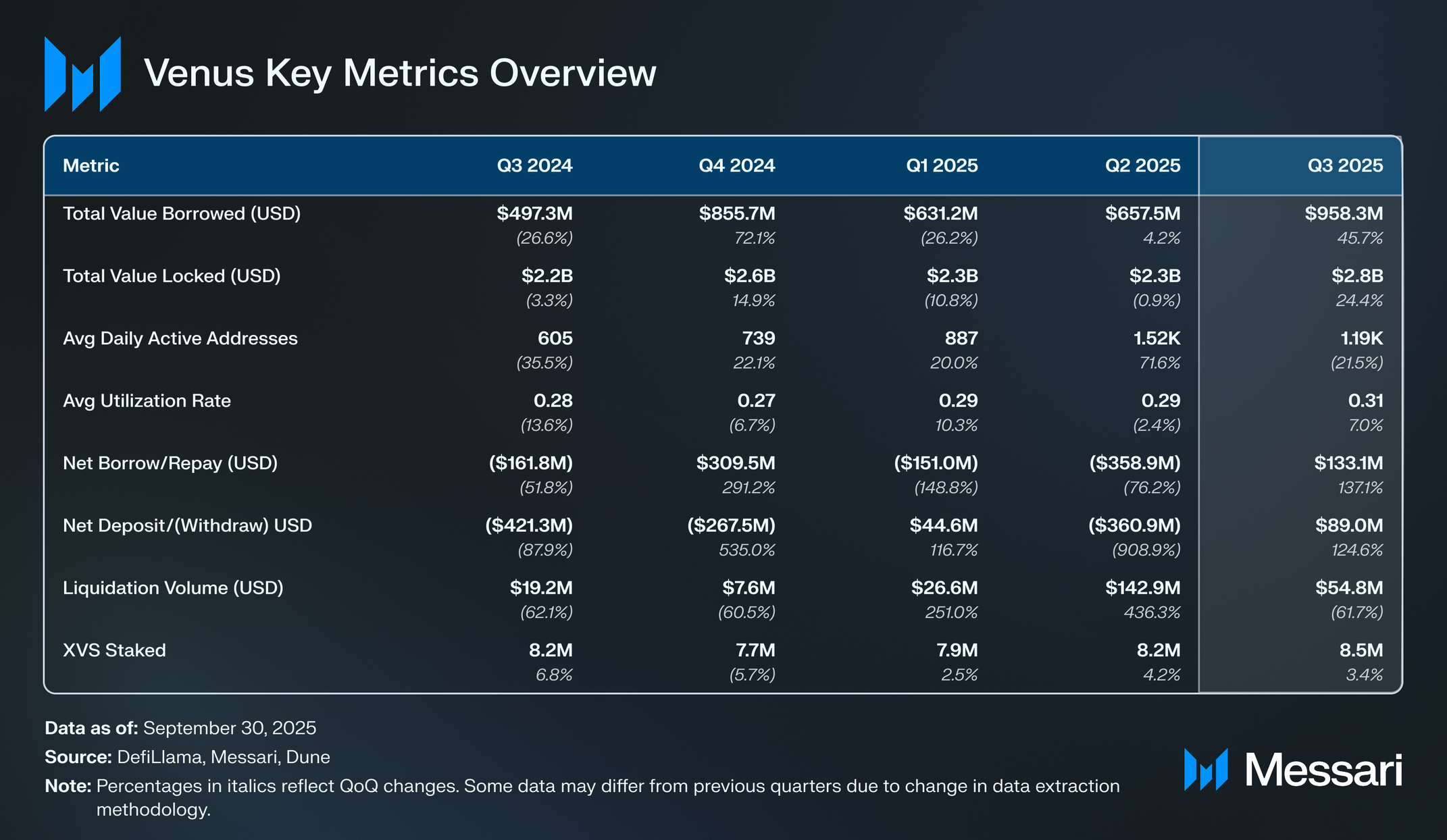 2025년 3분기 전반에 걸쳐 비너스 프로토콜은 8개 지원 네트워크에서 운영되며 일관된 기술적 성능을 유지했지만, 이 분기는 사용자 대상 피싱 공격으로 일시적으로 중단되었다.