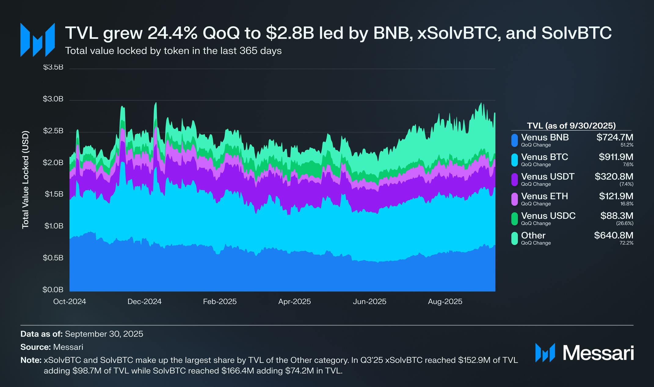 비너스 프로토콜의 예치 총액(TVL)은 2025년 3분기 말 전분기 대비 24.4% 증가한 28억 달러를 기록하며 2023년 말 이후 가장 강력한 분기별 확장을 나타냈다. 이러한 증가는 주로 BNB, xSolvBTC, SolvBTC 담보 성장에 의해 주도되었으며, 광범위한 위험 선호 심리와 새로운 생산적 비트코인 자산의 통합에 의해 지원되었다.