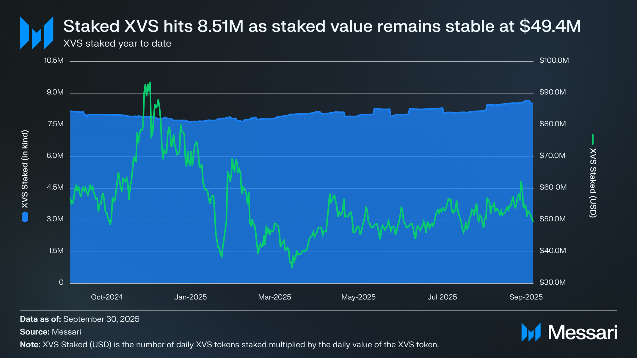 비너스의 스테이킹된 XVS는 2025년 3분기 전분기 대비 3.4% 증가하여 820만 개에서 850만 개로 늘었다. 스테이킹된 XVS의 달러 가치는 2.4% 증가한 4,940만 달러로 2025년 2분기 4,820만 달러에서 증가했다. 이러한 소폭 증가는 XVS 가격이 5.85달러에서 5.80달러로 소폭 하락했음에도 불구하고 발생했으며, 이는 성장이 주로 가격 상승보다는 더 높은 스테이킹 참여에 의해 주도되었음을 나타낸다. 스테이킹 활동은 5분기 연속 꾸준하게 유지되었으며, 이는 비너스 거버넌스에 대한 일관된 참여와 장기 토큰 보유자와 프로토콜 인센티브 사이의 지속적인 정렬을 나타낸다.