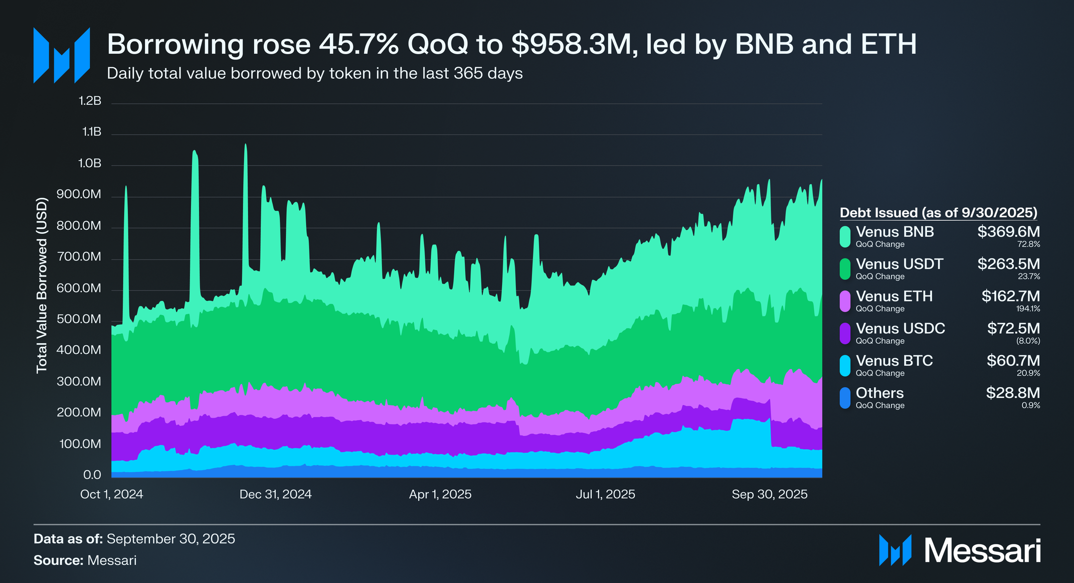 비너스 프로토콜의 차입 활동은 2025년 3분기 급격하게 가속화되어 대출 총액(TVB)이 전분기 대비 45.7% 증가한 9억 5,830만 달러를 기록했으며, 이는 2분기 6억 5,750만 달러에서 증가한 수치다. 이러한 급증은 BNB 및 ETH 차입의 강력한 성장이 주도하는 대출 수요의 광범위한 회복을 반영했으며, 스테이블코인 및 BTC 시장에서의 재참여도 동반했다.