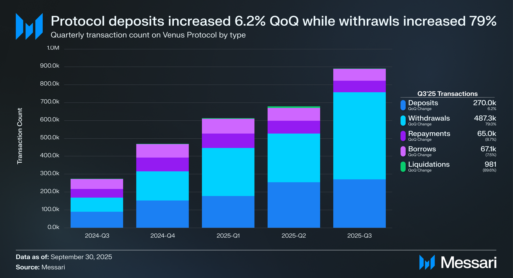 비너스 프로토콜의 사용자 활동은 2025년 3분기 높은 수준을 유지했으며, 일일 활성 사용자의 완화에도 불구하고 대부분의 카테고리에서 트랜잭션 수가 증가했다. 이 분기는 변화하는 시장 상황 속에서 지속적인 사용자 참여와 적극적인 포트폴리오 재조정을 시사하는 예금과 인출 모두의 주목할 만한 증가를 보였다.