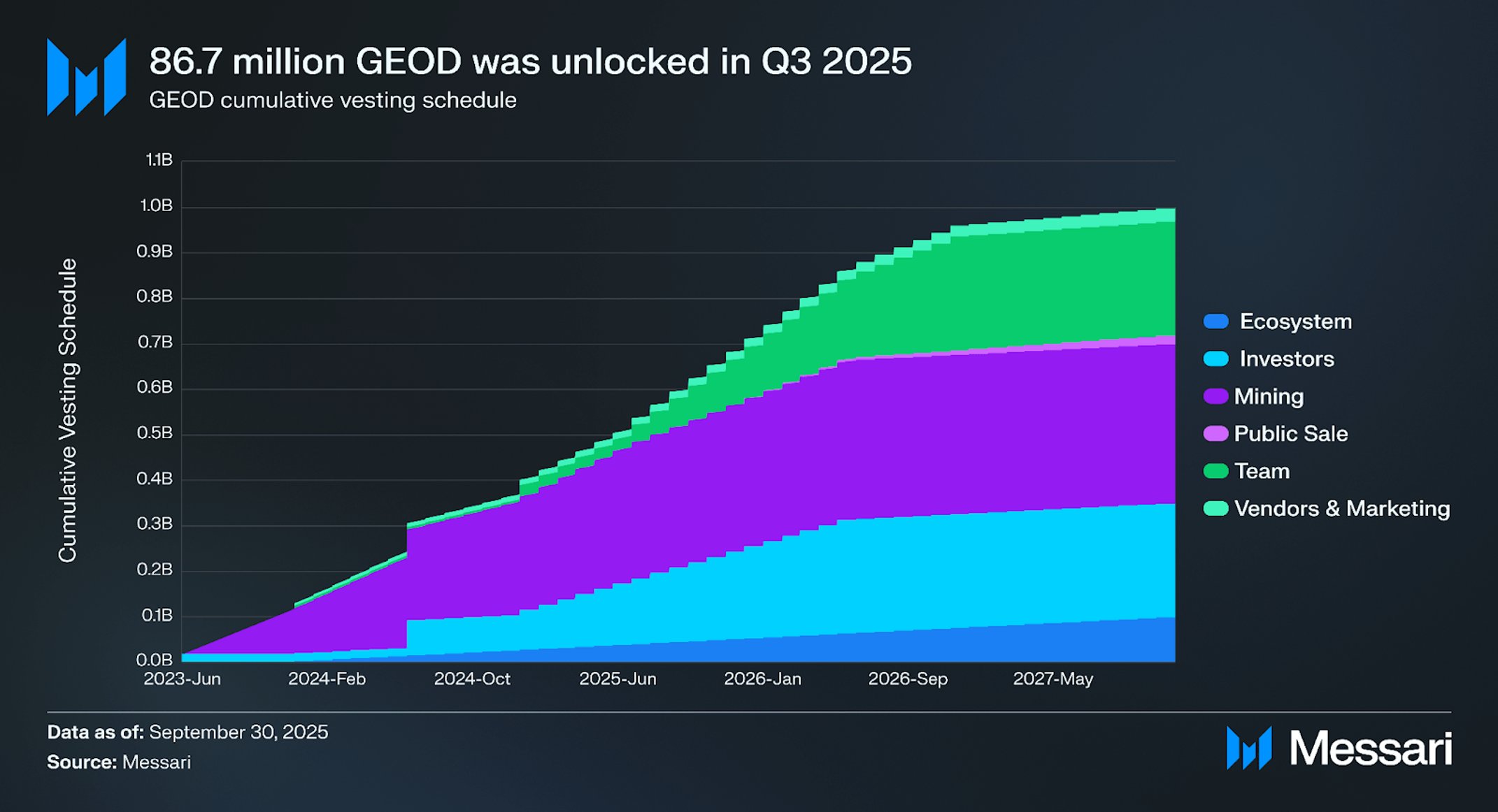 GEOD 토큰의 총 공급량은 10억 개로 제한되어 있으며, 추가 발행 계획은 없다. 일일 채굴 보상은 고정된 일정에 따라 베이스 스테이션 운영자에게 분배되며, 팀, 투자자, 생태계에 대한 할당은 다년간의 베스팅 프레임워크를 따른다. 2025년 3분기 말까지 총 공급량의 62.3%가 잠금 해제되었으며, 이는 이전 분기 53.7%에서 증가한 수치다. 3분기에 8,670만 개의 토큰이 잠금 해제되었으며, 이는 2분기 7,380만 개에서 17.5% 증가한 것이다.
