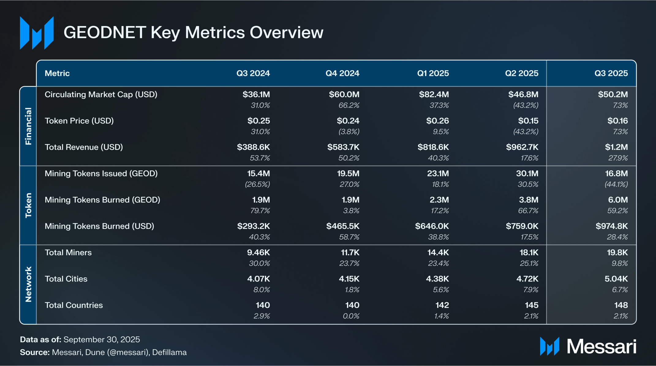 2025년 3분기 지오드넷은 5,000개 이상의 도시와 148개국에 걸쳐 19,800개 이상의 활성 새틀라이트 마이너를 넘어서며 전 세계 최대 탈중앙화 RTK 네트워크로서의 위치를 유지했다. 시장과 토큰 성과는 완만하게 개선되어 GEOD의 유통 시가총액이 7.3% 증가한 5,020만 달러를 기록했고 가격은 0.15달러에서 0.16달러로 상승했다. 이러한 증가는 광범위한 시장 변동성에도 불구하고 증가하는 온체인 활동과 안정적인 수요를 반영했다. 네트워크 수익은 지속적인 스테이션 확장에 힘입어 전분기 대비 27.9% 증가한 120만 달러 이상을 기록했다. 네트워크는 또한 RTK 데이터 수요와 반복적 사용이 강화되면서 600만 GEOD(97만 4,800달러 가치)가 공급에서 제거되는 사상 최고 분기별 토큰 소각을 기록했다.
