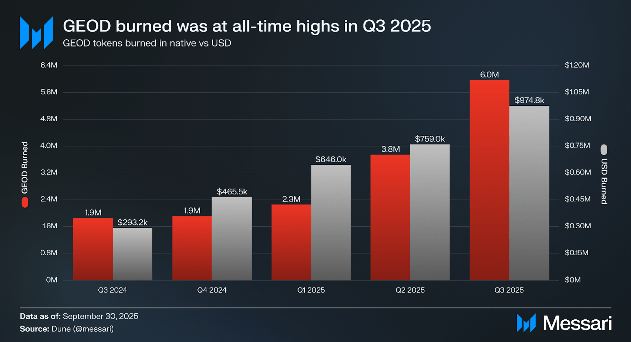 2025년 3분기 소각된 GEOD 토큰의 양은 600만 개에 달했으며, 이는 전분기 대비 59.2% 증가한 것으로 총 가치는 97만 4,800달러 이상으로 전분기 대비 28.4% 증가했다. 소각 거래량의 지속적인 증가는 RTK 데이터 판매로부터의 꾸준한 수익을 반영하며 더 안정적이고 반복적인 네트워크 사용으로의 전환을 나타낸다.