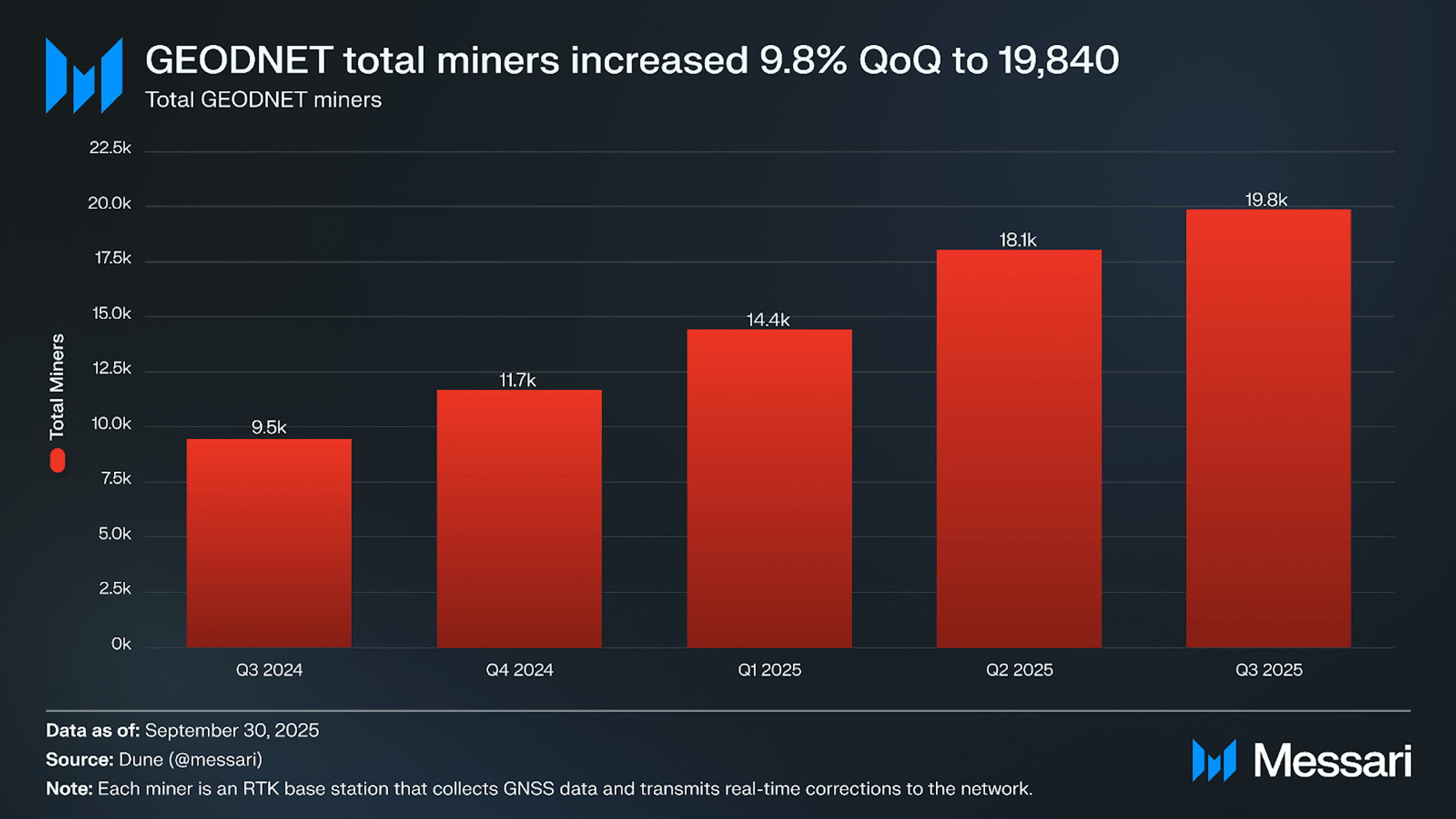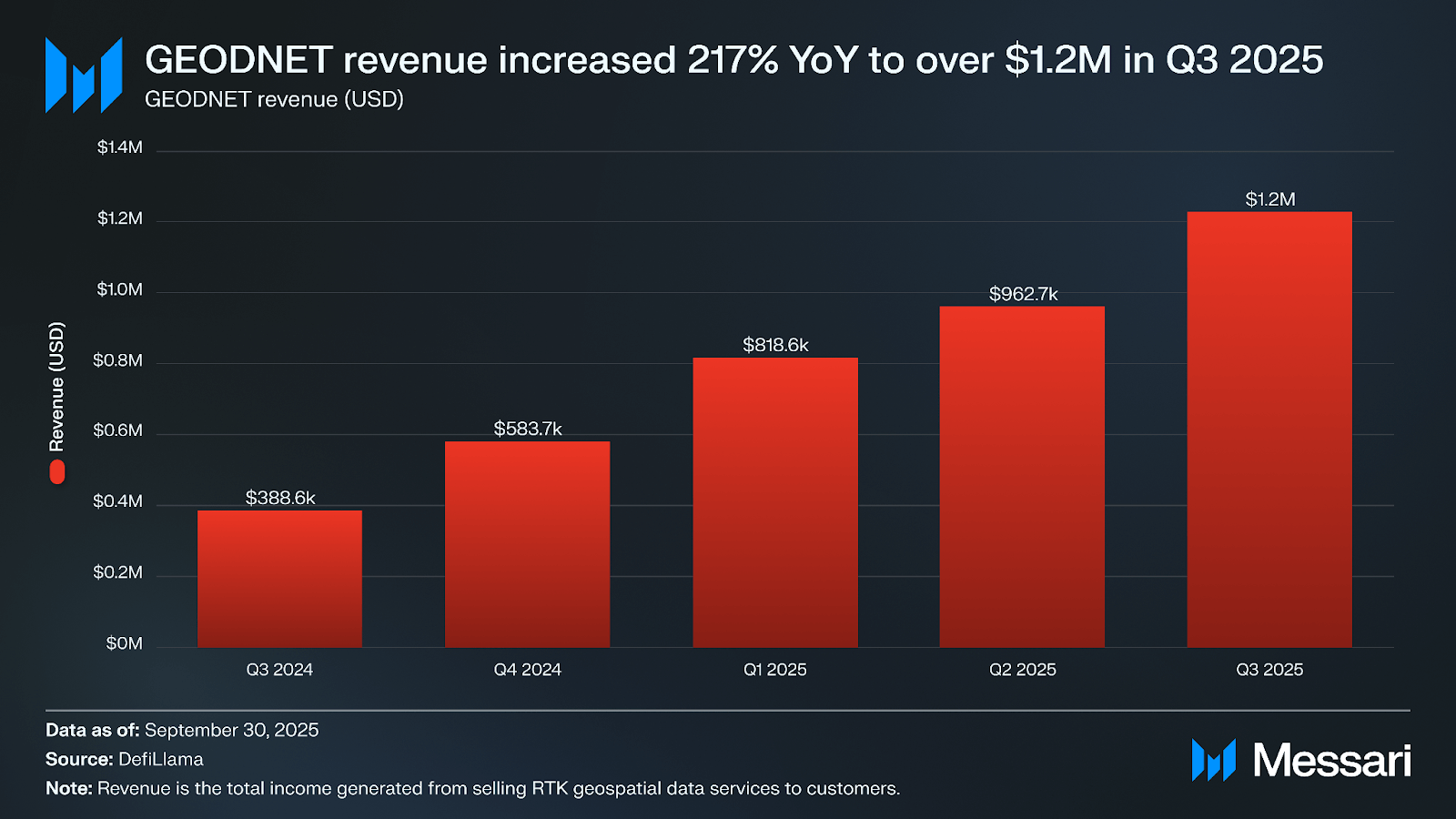 지오드넷은 고객에게 고정밀 RTK 지리공간 데이터 서비스를 판매하여 수익을 창출한다. 2025년 3분기 수익은 전분기 대비 27.9% 증가했고 전년 대비 216.9% 증가하여 38만 8,600달러에서 120만 달러 이상으로 상승했으며, RTK 스테이션 네트워크의 전 세계적 확장에 의해 지원받았다. 이는 지오드넷의 연간 수익을 약 500만 달러로 끌어올려 부문 중간값을 훨씬 상회하는 수치다. 메사리의 디핀 현황(State of DePIN) 보고서에 따르면, 분석된 80개 디핀 프로젝트 중 25개만이 수익을 창출하며, 물리적 자원 네트워크(Physical Resource Networks, PRNs)의 중간 수익은 73만 달러다. 지오드넷의 성과는 특히 하드웨어 기반 네트워크 중에서 최고 수익을 올리는 디핀 프로토콜 중 하나로서의 지위를 강조한다.
