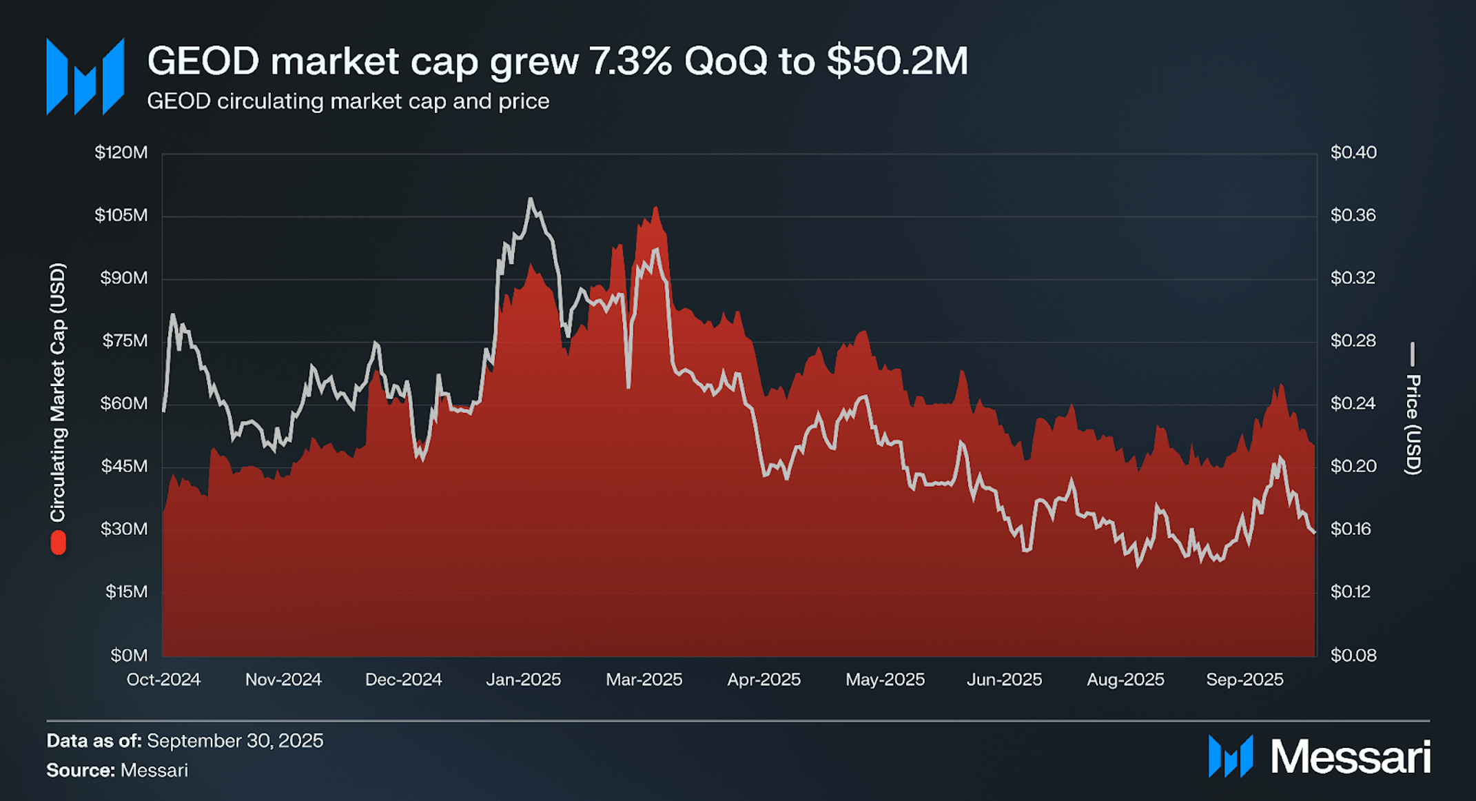 GEOD의 유통 시가총액은 7.3% 증가하여 2025년 3분기 4,680만 달러에서 5,020만 달러로 성장했다. GEOD 가격도 2025년 2분기 0.15달러에서 0.16달러로 7.3% 성장했다.