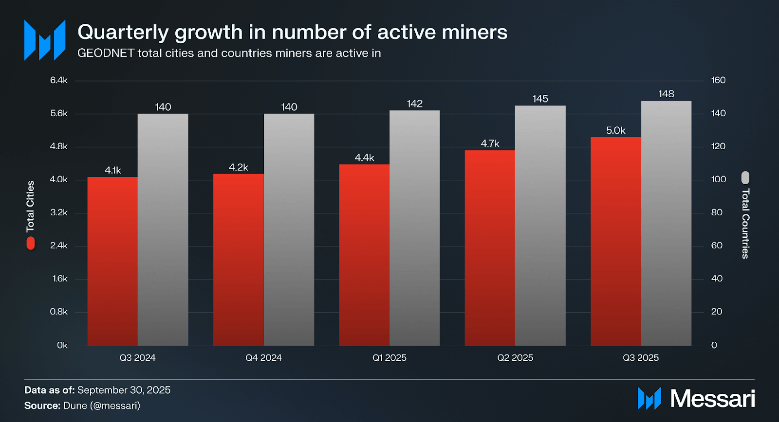 활성 새틀라이트 마이너가 있는 도시 수는 4,650개에서 5,037개로 증가하여 전분기 대비 6.7% 증가를 나타냈다. 국가별 분포도 145개에서 148개로 확대되며 성장했다. 이러한 증가는 더 높은 품질의 스테이션 배포를 장려하기 위해 채굴 보상을 성과 기반 모델로 전환한 GIP-6 롤아웃의 지속에 의해 주도되었을 가능성이 높다. 토큰 배출 증가 대신 성과 지표에 보상을 연결함으로써, 이 메커니즘은 데이터 신뢰성을 개선하면서 지속 가능한 네트워크 성장을 지원하고 토큰 공급 규율을 유지한다.