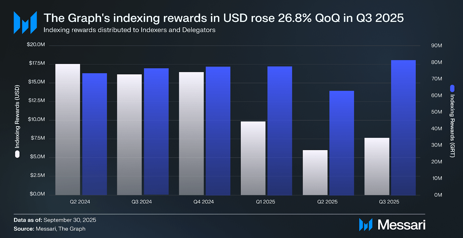 인덱싱 보상은 2025년 3분기에 의미 있게 증가했다. GRT로 측정하면 보상은 전분기 대비 29.6% 증가하여 6천300만 GRT에서 8천160만 GRT로 늘어났으며, 이는 단일 분기 인덱싱 보상으로 사상 최고치다. 이러한 인덱싱 보상의 반등은 2분기에 전분기 대비 19.1% 감소한 이후 특히 긍정적이다.
