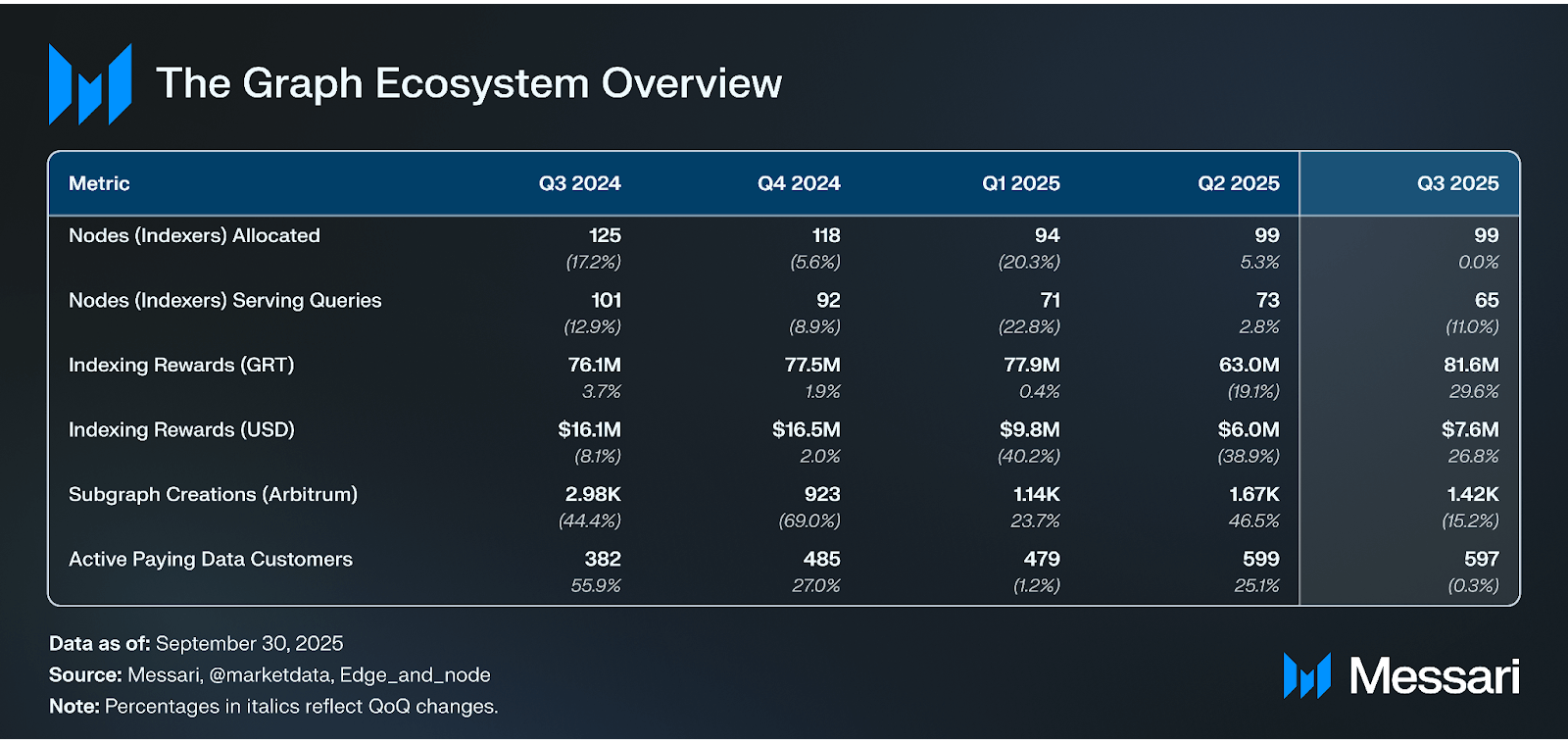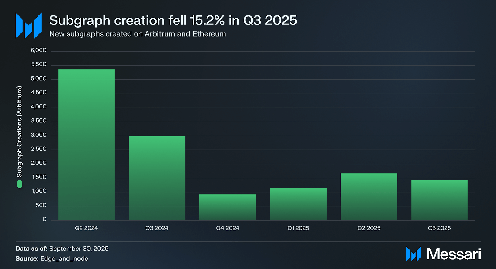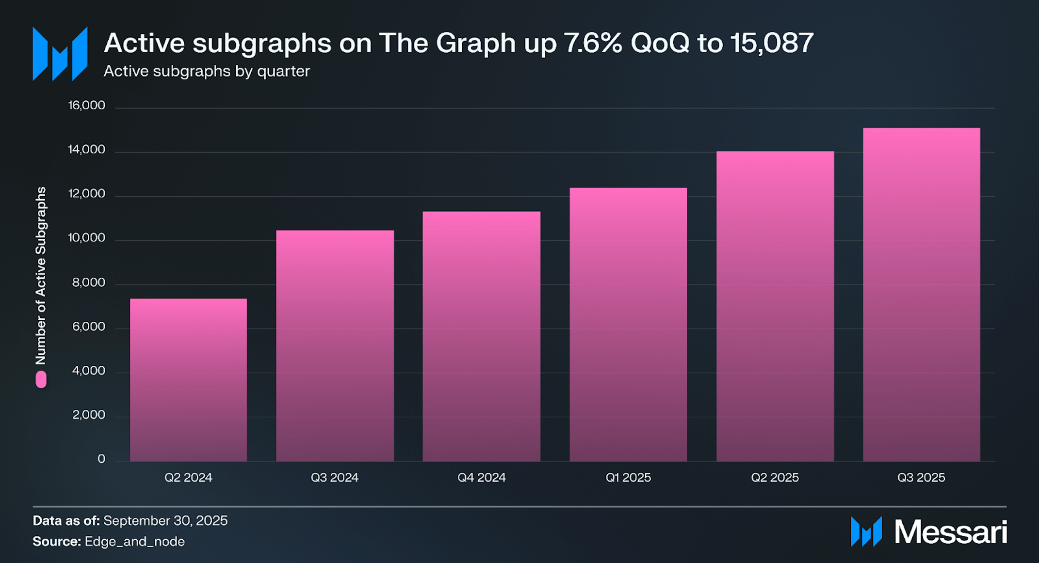 • 활성 서브그래프(Subgraph)가 15,087개에 도달하여 전분기 대비 7.6% 증가했으며, 새로운 배포가 둔화되었음에도 강력한 개발자 참여를 보여주었다.