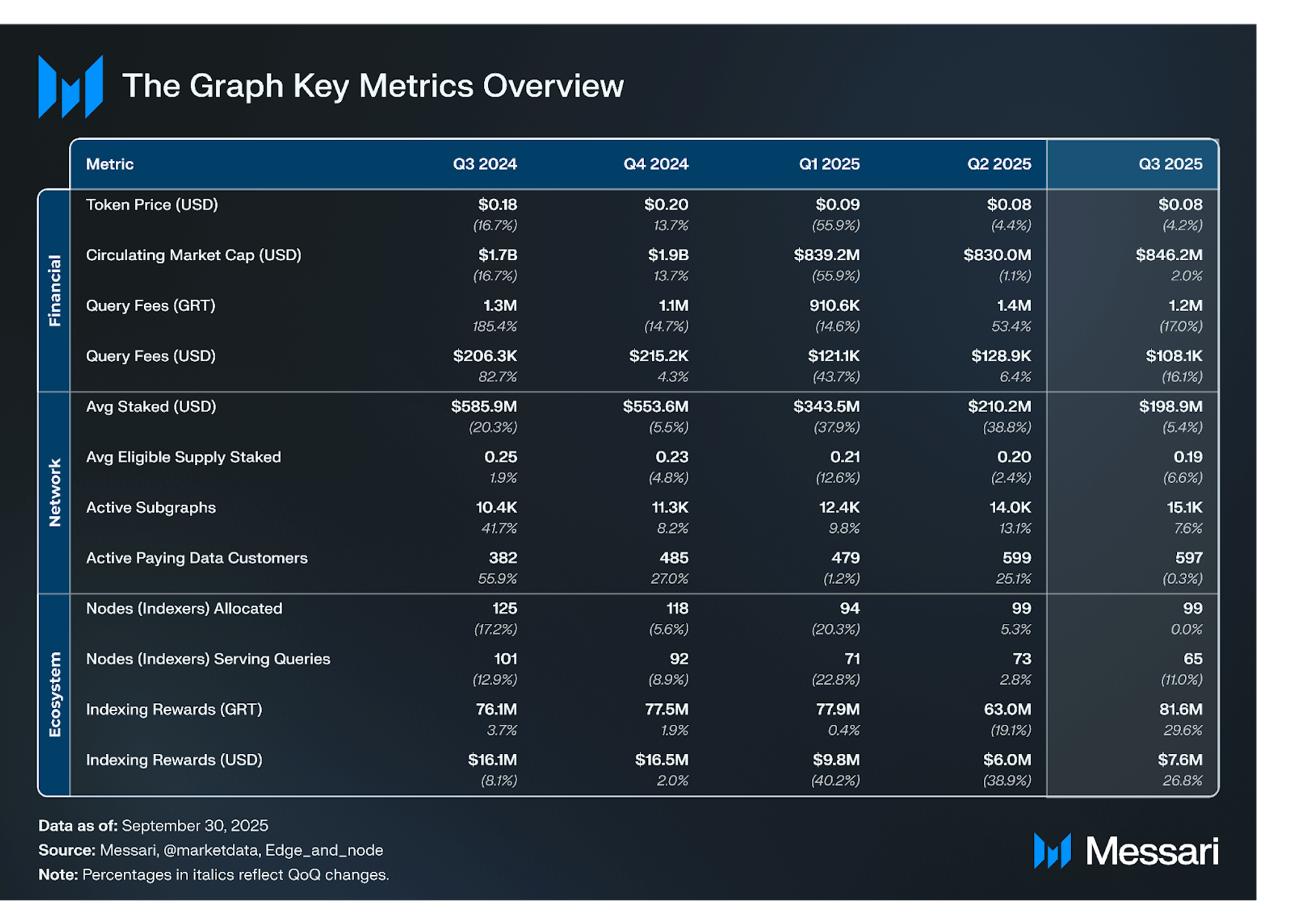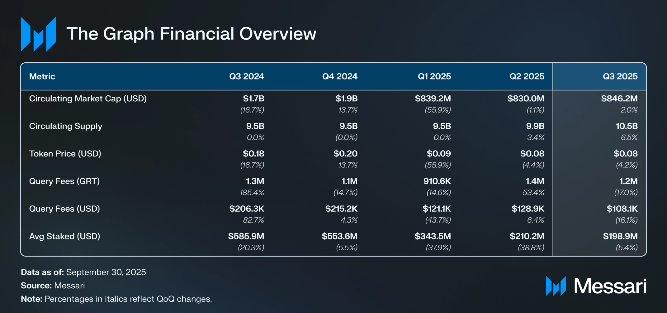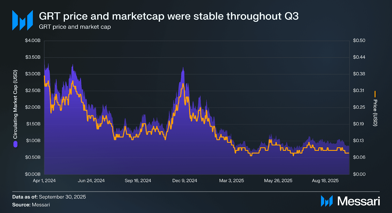 더 그래프의 재무 프로필은 2025년 3분기에도 상대적 안정성을 계속 보였다. 순환 시가총액은 프로토콜 발행 및 보상 분배로 인해 GRT 순환 공급량이 전분기 대비 6.5% 증가하여 99억 개에서 105억 개로 늘어나면서 8억3천30만 달러에서 8억4천620만 달러로 전분기 대비 2.0% 증가했다.