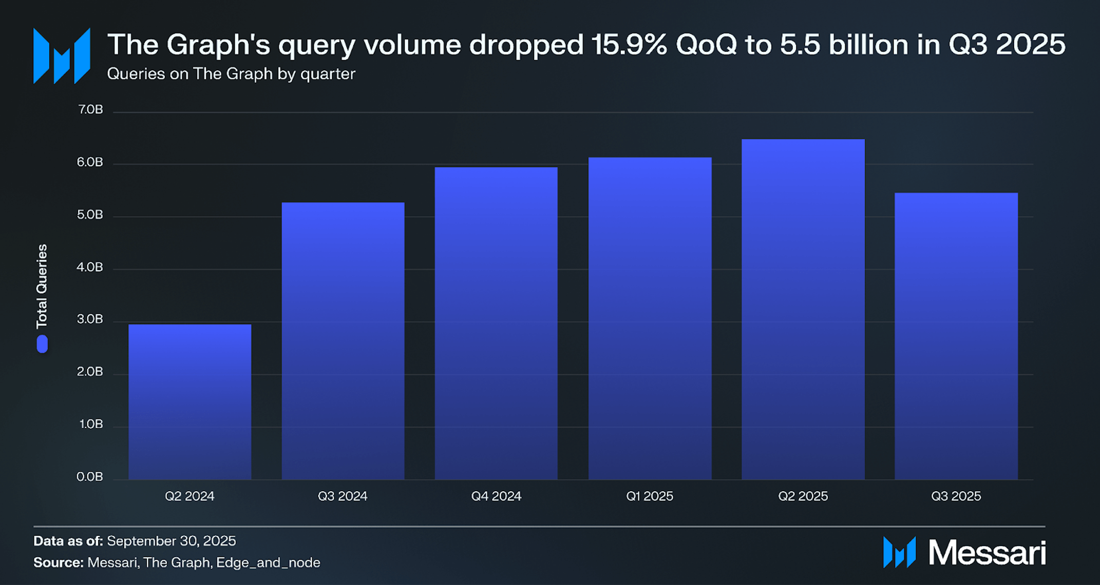 더 그래프의 분기별 쿼리 볼륨은 2024년 2분기 이후 처음으로 감소하여, 2분기 사상 최고치인 64억9천만 쿼리에서 54억6천만으로 전분기 대비 15.9% 감소했다. 하락에도 쿼리 수요는 강력하게 유지되며, 체인과 애플리케이션 전반에 걸친 탈중앙화 데이터 액세스에 대한 지속적인 관심을 반영한다.
