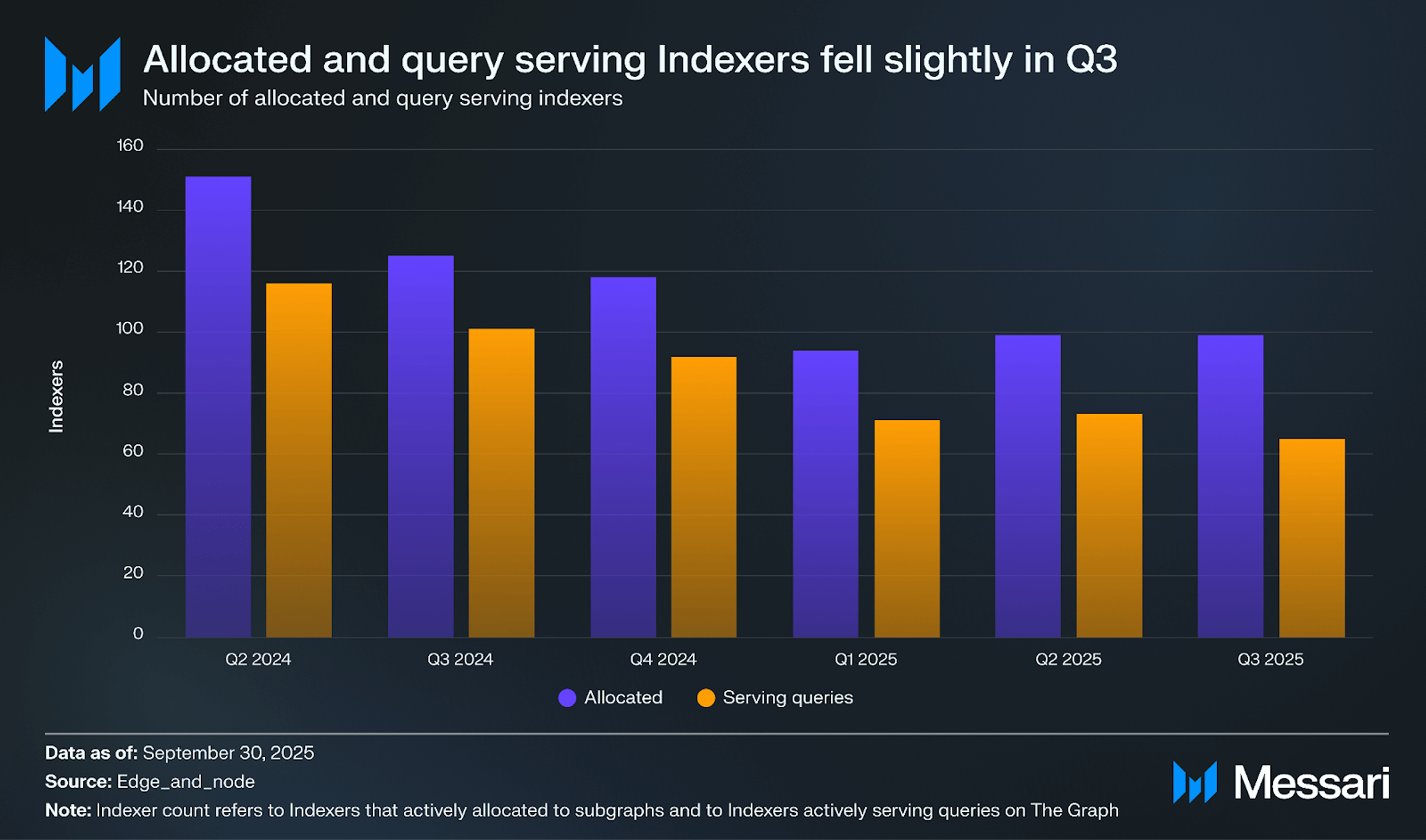 더 그래프에 할당된 스테이크를 가진 인덱서의 수는 3분기에 99개로 변동이 없었다. 그러나 쿼리를 제공하는 활성 인덱서는 73개에서 65개로 소폭 감소하여 전분기 대비 10.9% 감소했다. 소폭 감소에도 운영자 참여는 전반적으로 꾸준하게 유지되며, 인덱서 집합은 서브그래프에 대한 확장되는 수요와 계속 보조를 맞추고 있다.