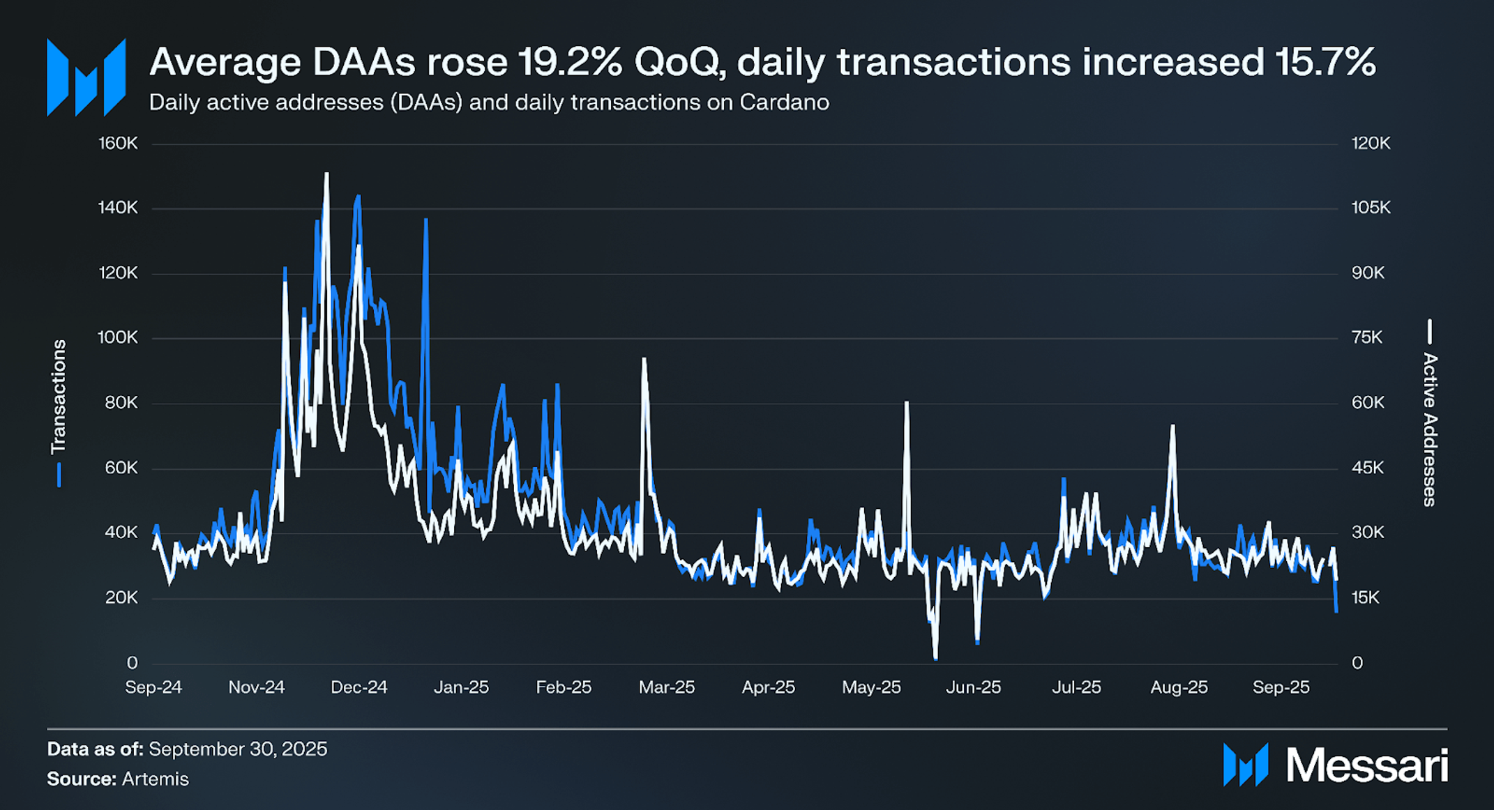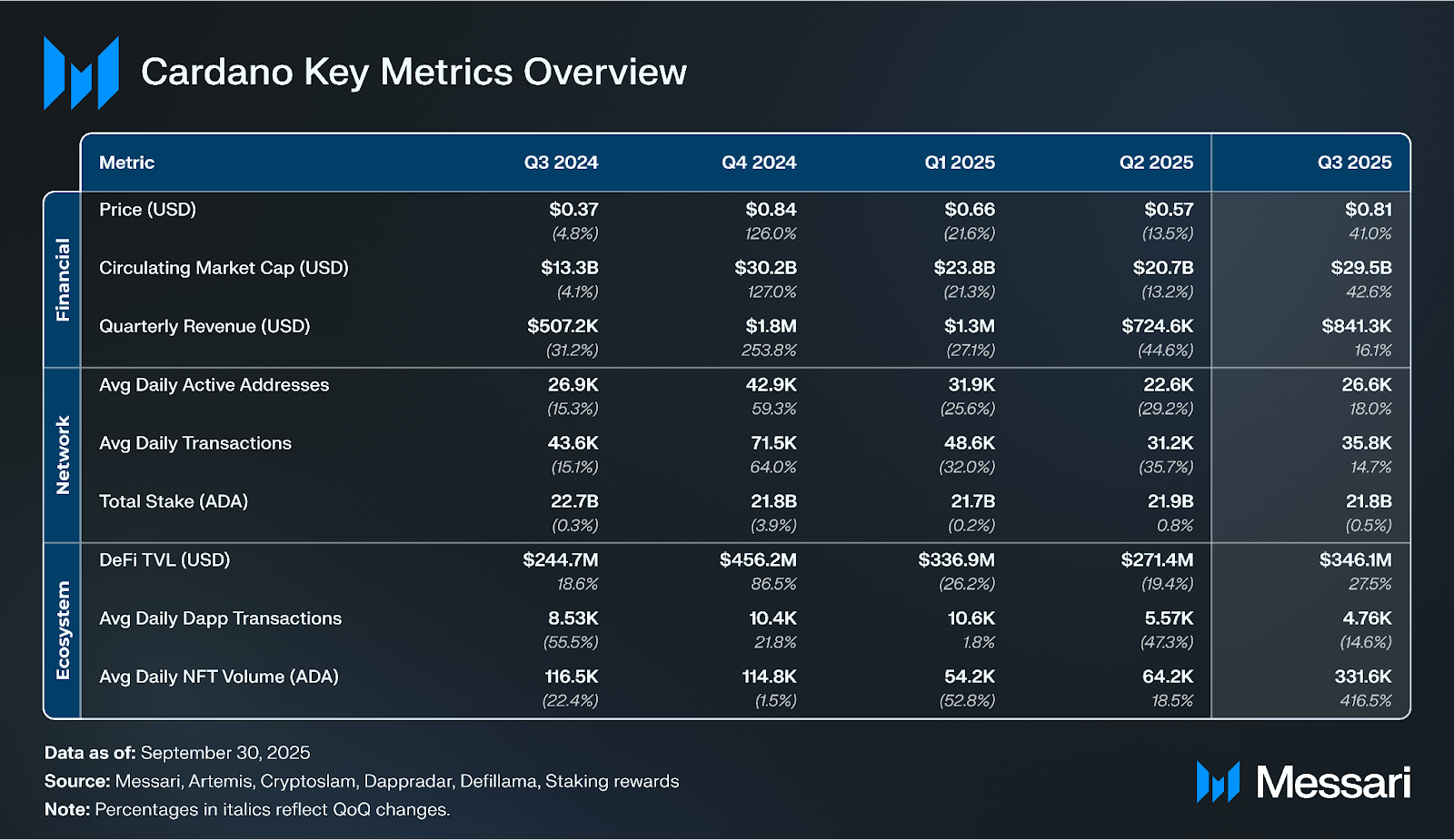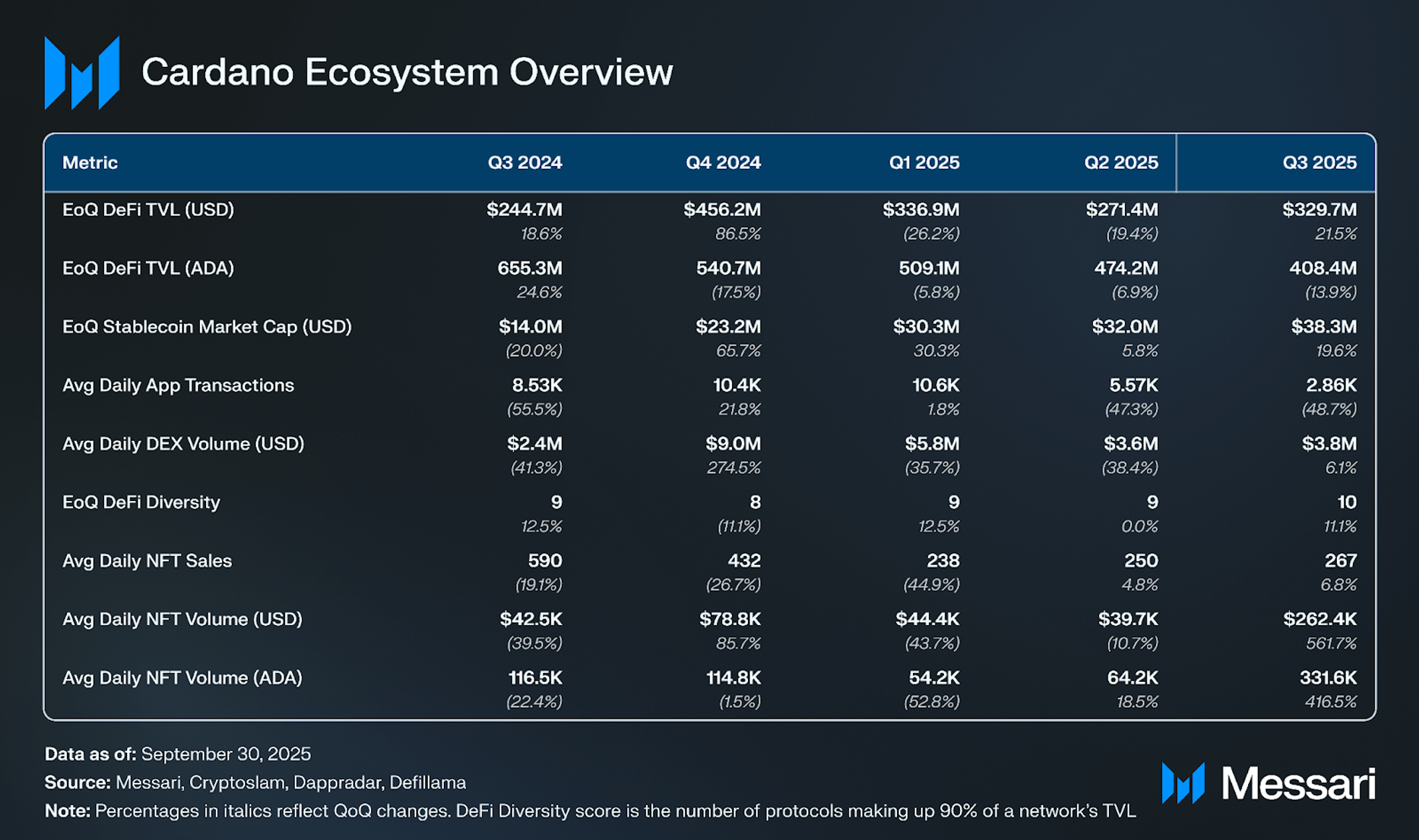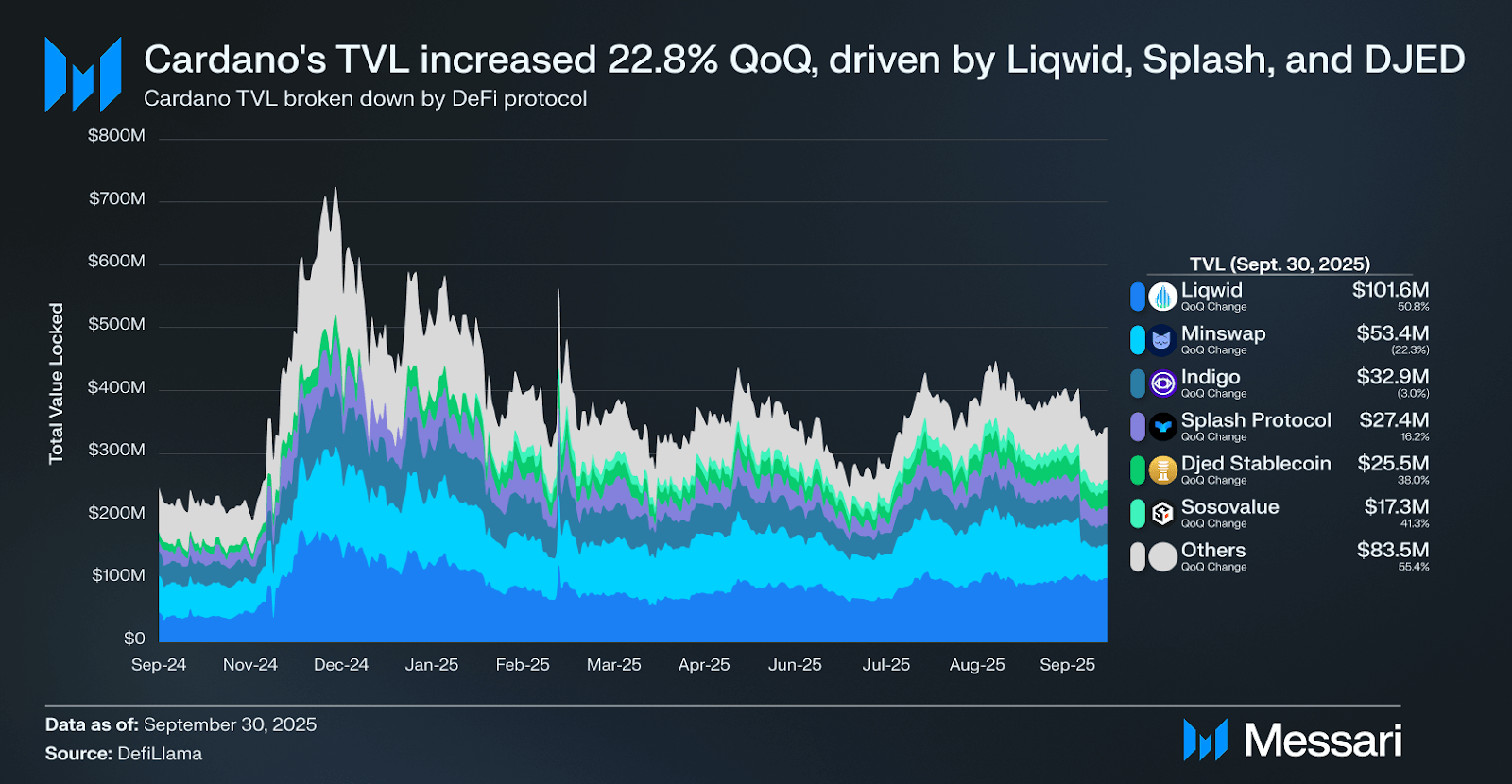 카르다노는 NFT, 디파이, 스테이블코인과 같은 분야에 걸친 성장으로 2025년 3분기를 마무리했다. 리퀴드의 확장과 더 큰 프로토콜 다양성에 힘입어 디파이 TVL이 전분기 대비 17.6% 증가하여 3억4천160만 달러를 기록하면서 유동성이 심화되었다. 첫 번째 완전히 커뮤니티 선출된 헌법위원회 및 카르다노 재무에서 인출된 ADA를 위한 스마트 컨트랙트 기반 운영의 전면 배치를 포함한 거버넌스 이정표는 인출된 자금 및 거버넌스 제안의 커뮤니티 중심적이고 감사 가능한 관리로의 전환을 표시했다.