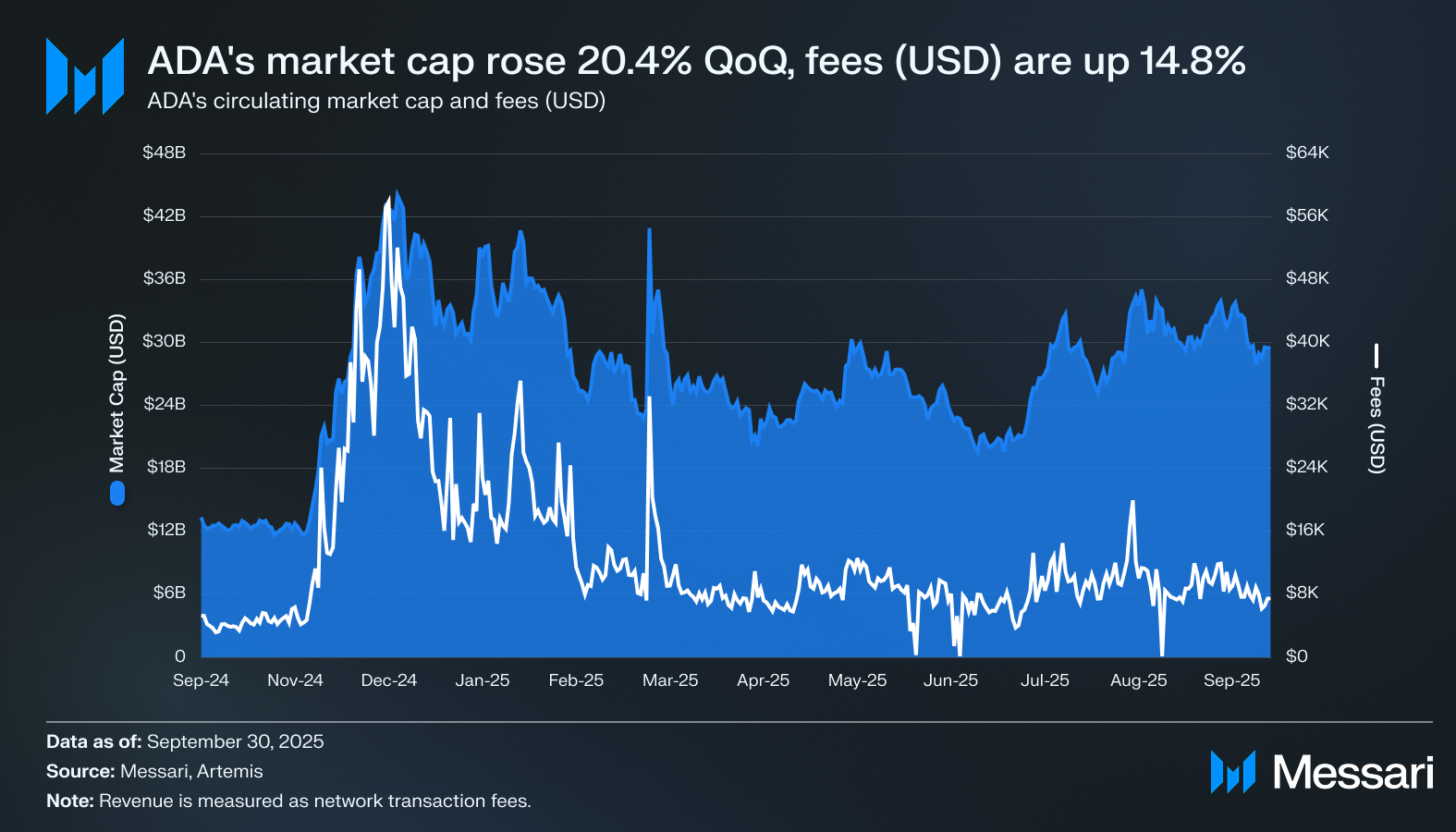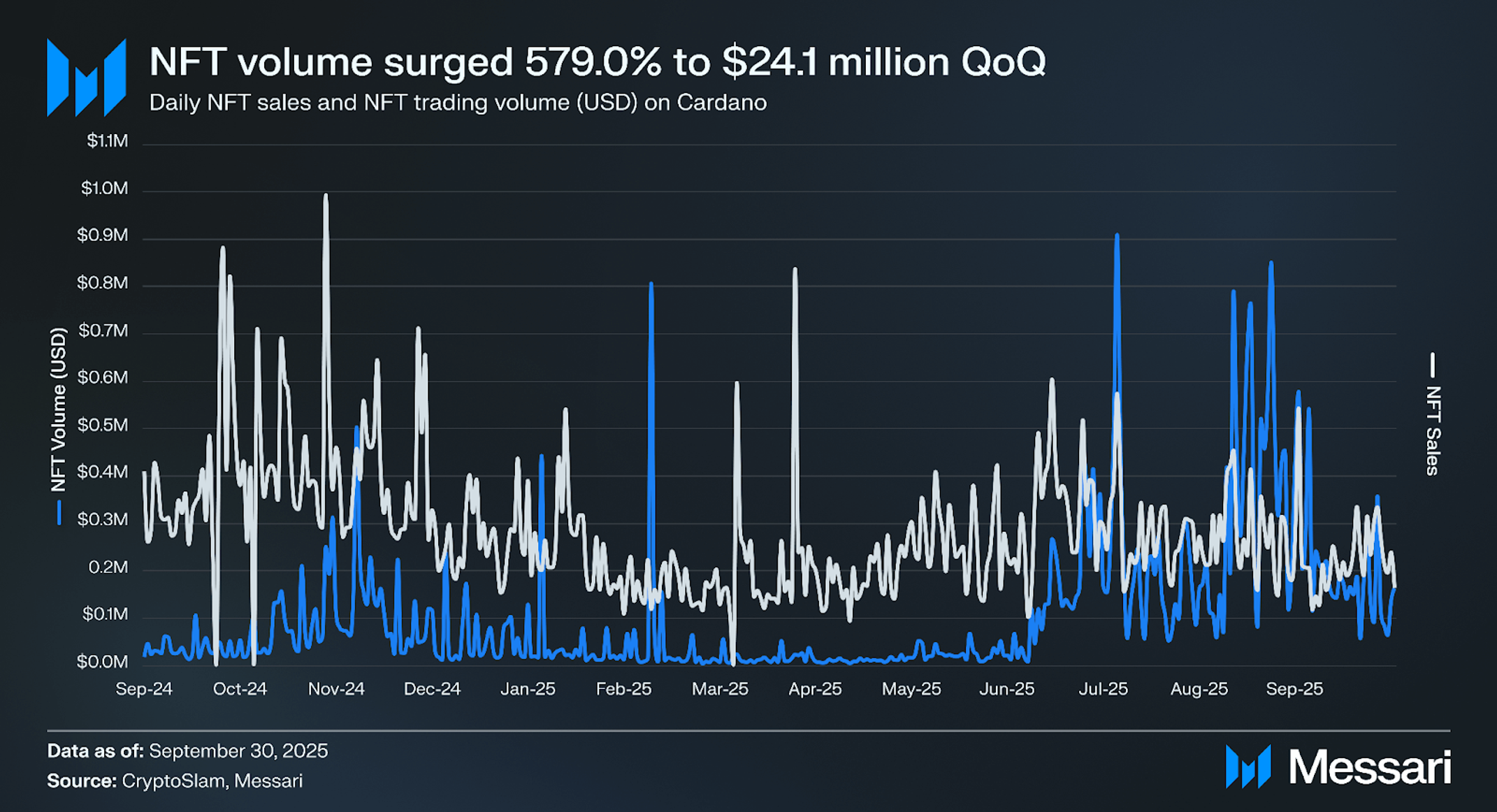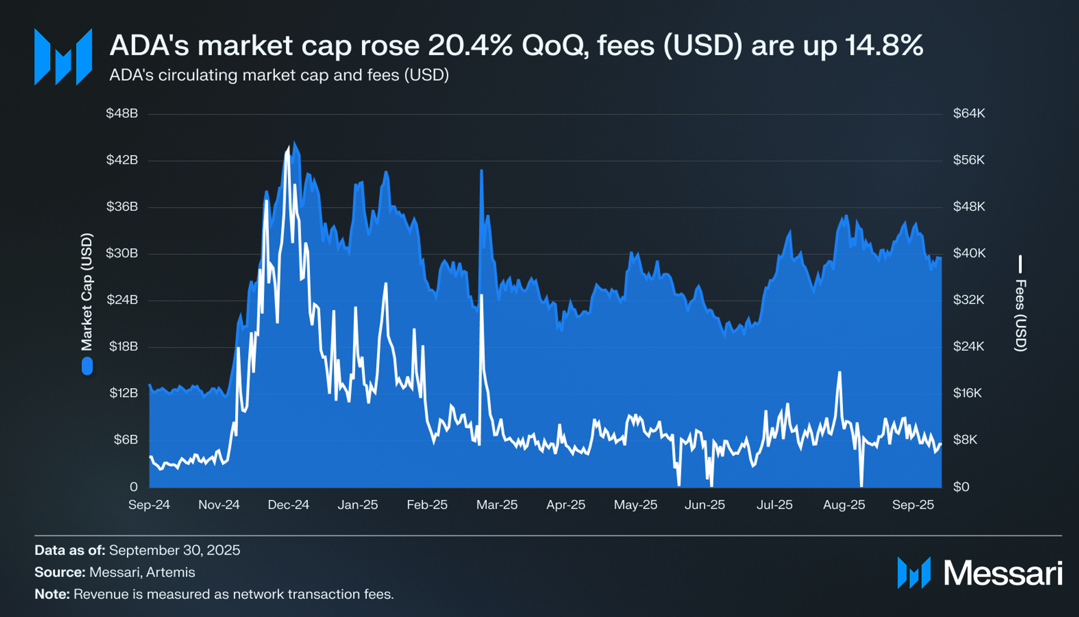 카르다노는 NFT, 디파이, 스테이블코인과 같은 분야에 걸친 성장으로 2025년 3분기를 마무리했다. 리퀴드의 확장과 더 큰 프로토콜 다양성에 힘입어 디파이 TVL이 전분기 대비 17.6% 증가하여 3억4천160만 달러를 기록하면서 유동성이 심화되었다. 첫 번째 완전히 커뮤니티 선출된 헌법위원회 및 카르다노 재무에서 인출된 ADA를 위한 스마트 컨트랙트 기반 운영의 전면 배치를 포함한 거버넌스 이정표는 인출된 자금 및 거버넌스 제안의 커뮤니티 중심적이고 감사 가능한 관리로의 전환을 표시했다.