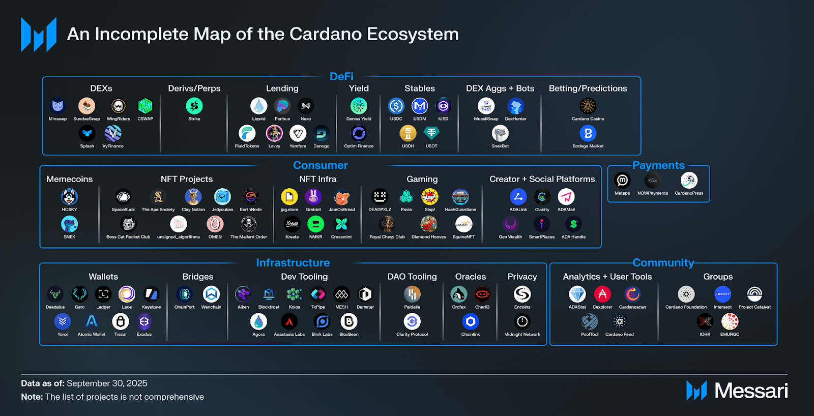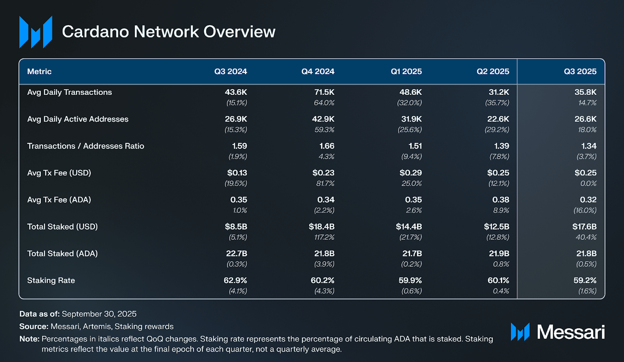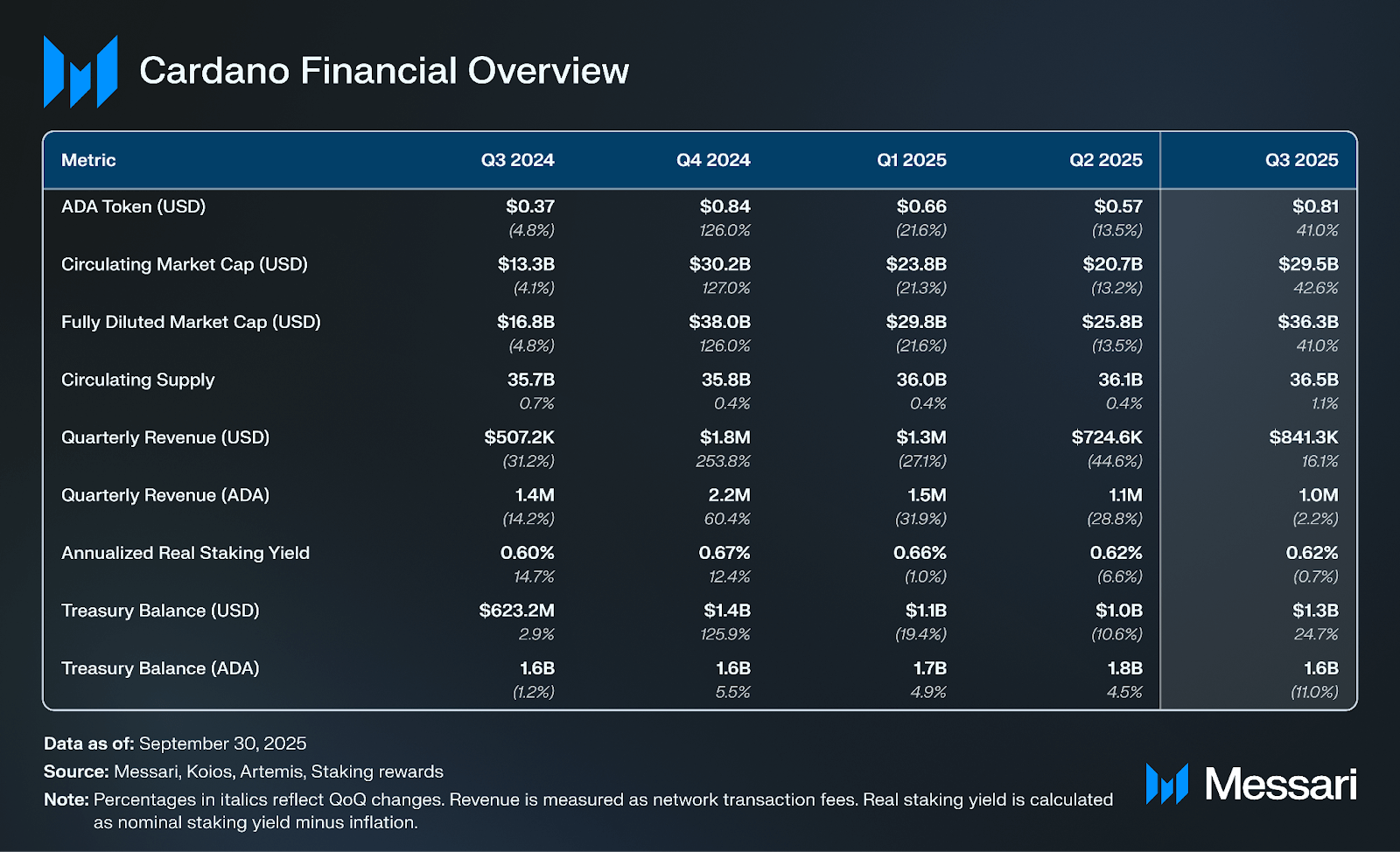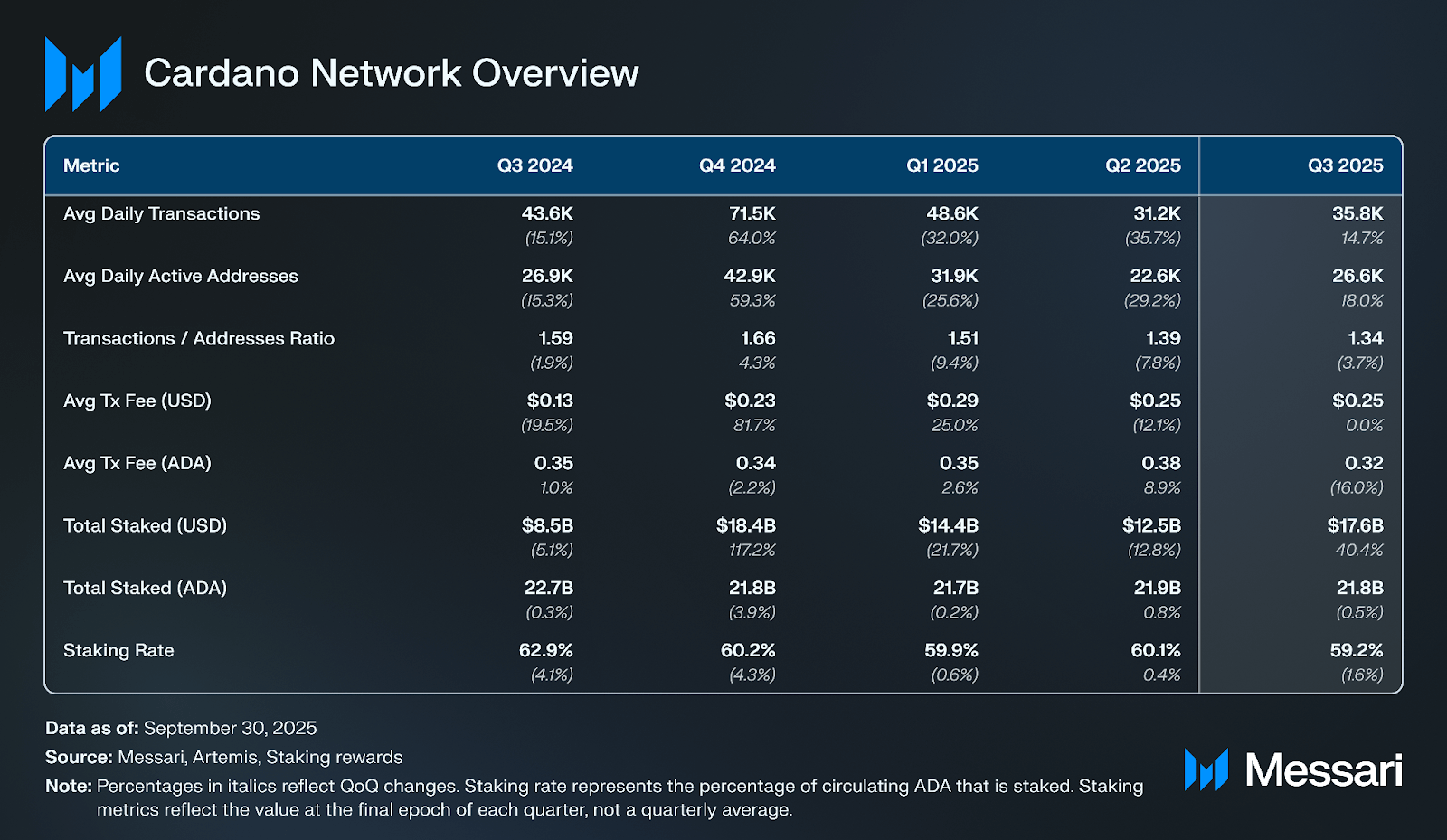 카르다노는 NFT, 디파이, 스테이블코인과 같은 분야에 걸친 성장으로 2025년 3분기를 마무리했다. 리퀴드의 확장과 더 큰 프로토콜 다양성에 힘입어 디파이 TVL이 전분기 대비 17.6% 증가하여 3억4천160만 달러를 기록하면서 유동성이 심화되었다. 첫 번째 완전히 커뮤니티 선출된 헌법위원회 및 카르다노 재무에서 인출된 ADA를 위한 스마트 컨트랙트 기반 운영의 전면 배치를 포함한 거버넌스 이정표는 인출된 자금 및 거버넌스 제안의 커뮤니티 중심적이고 감사 가능한 관리로의 전환을 표시했다.