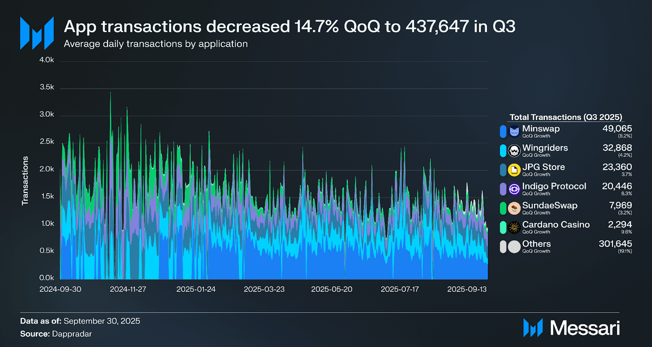 일일 평균 애플리케이션 거래는 3분기에 전분기 대비 14.7% 감소하여 437,647건을 기록했으며, 이는 2분기 연속 온체인 활동 감소를 나타낸다. DEX가 네트워크 사용의 주요 동인으로 남아 있지만, JPG 스토어(JPG Store)와 같은 NFT 마켓플레이스 및 카르다노 카지노(Cardano Casino)와 같은 게임 앱은 이번 분기에 계속 더 많은 거래를 보였다.