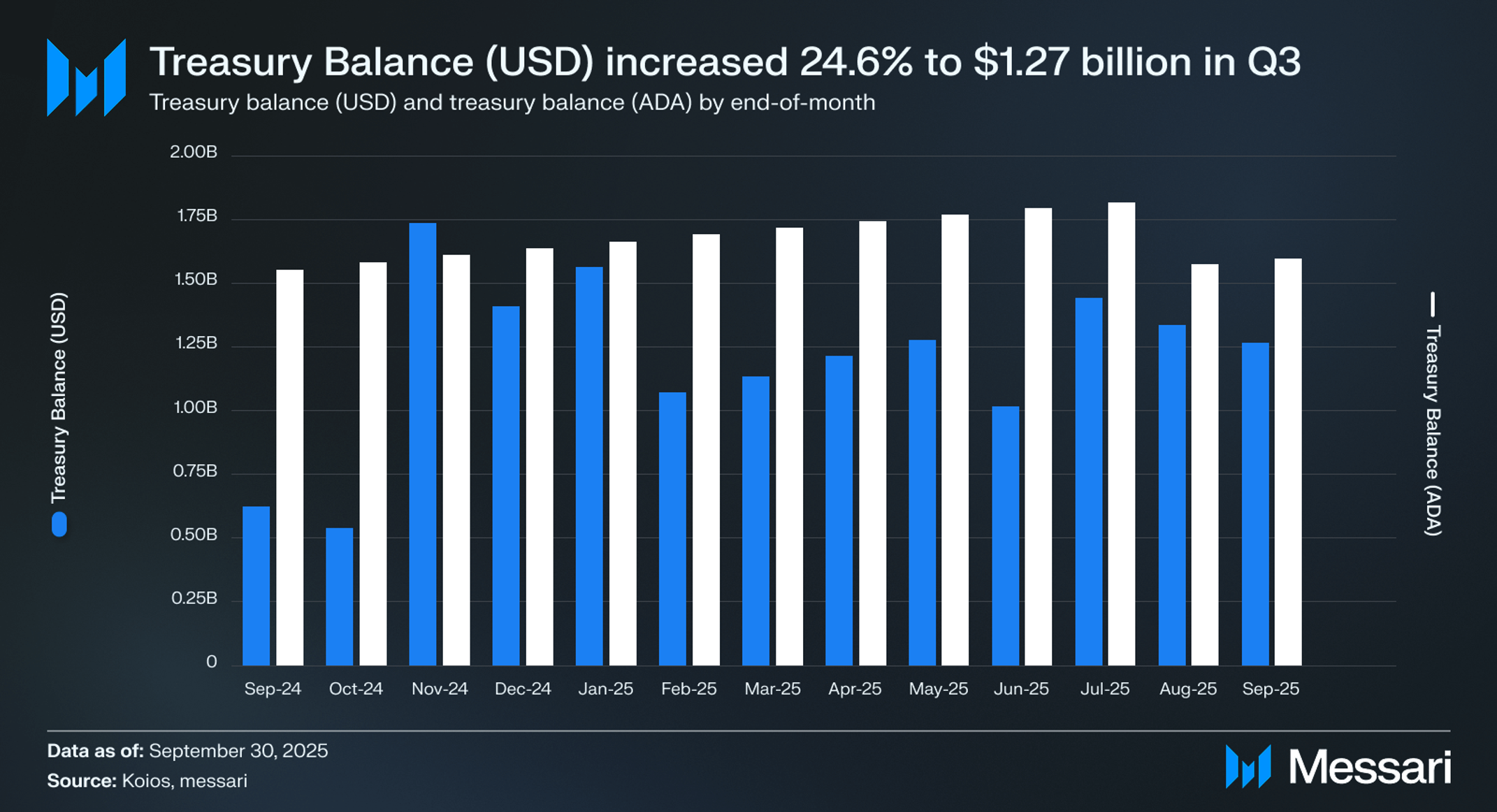 카르다노의 재무 잔액(ADA)은 전분기 대비 10.9% 감소하여 16억 ADA를 기록했으며, USD 가치는 24.6% 증가하여 13억 달러를 기록했다. 재무는 카르다노를 유지하고 개발하기 위한 자금을 제공하며, 2025년 1월 플로민(Plomin) 하드포크 이후 커뮤니티 거버넌스를 통해 리소스가 배치된다. 현재 카르다노 거래 수수료의 20%가 재무에 할당되며, 이는 거버넌스를 통해 조정될 수 있다.