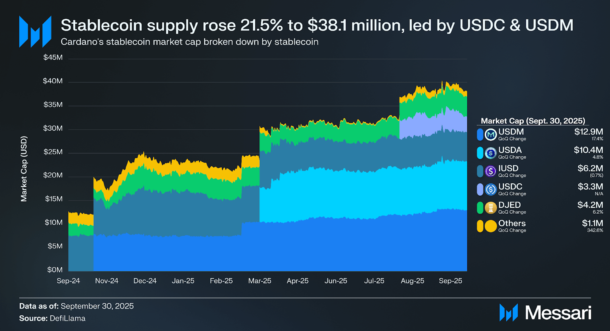 USDM과 USDA 모두 명목상으로 확장했지만, 견인력을 얻으면서 신규 진입자에게 시장 점유율을 양보했다. "기타"로 그룹화된 스테이블코인의 긴 꼬리는 전분기 대비 342.6% 급증하여 110만 달러를 기록하며 가장 빠른 성장을 기록했으며, 카르다노에서 대안 스테이블코인에 대한 더 광범위한 실험을 강조했다.