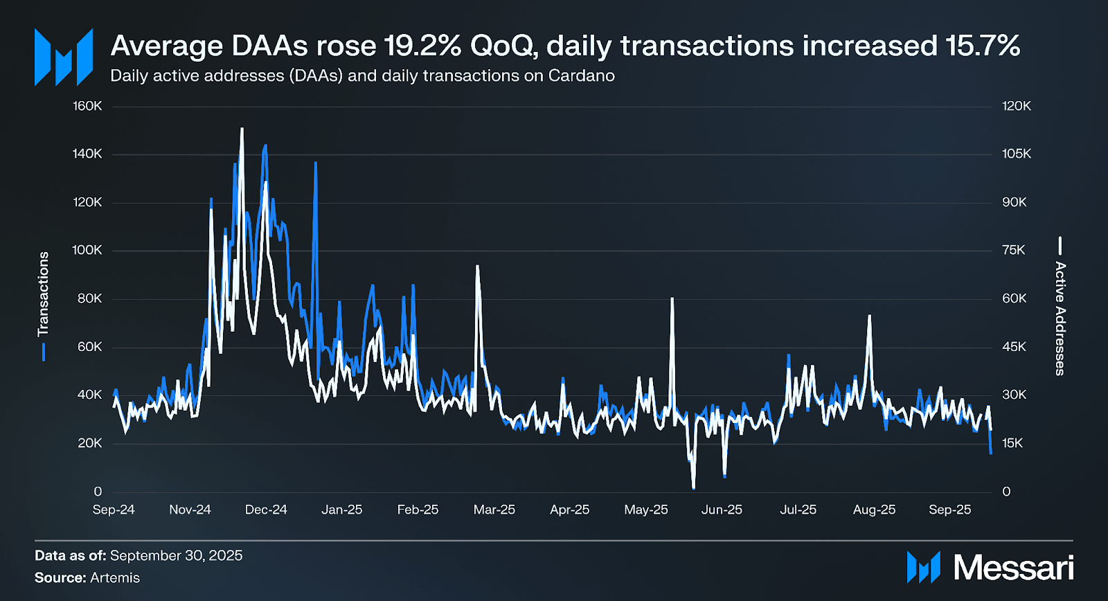 앱 활동이 다소 약세였지만, 일일 평균 활성 주소(DAA)가 19.2% 증가하고 ADA 가격이 전분기 대비 41% 상승하면서 네트워크 참여가 증가했다. 재단의 업데이트된 로드맵은 디파이 확장을 위한 유동성 지원과 네트워크 채택 가속화를 위한 벤처 펀딩을 강조하는 더 개입주의적인 입장을 나타냈다.