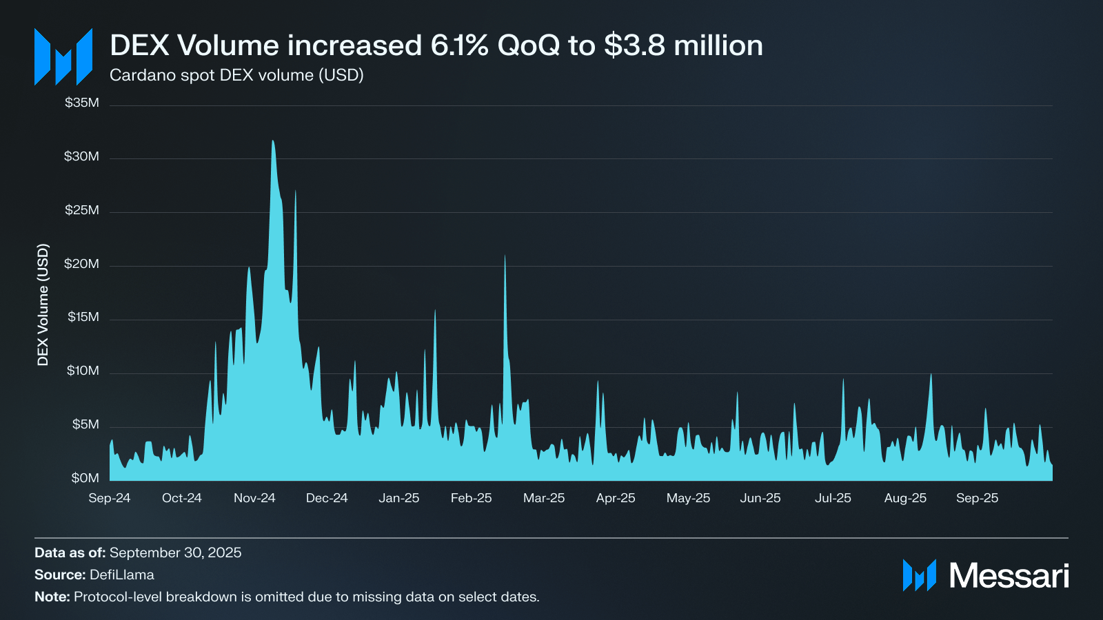 • 뮤슬리스왑(MuesliSwap)은 2021년 11월 26일에 출시되어 알론조 하드포크 이후 첫 번째 운영 DEX로 활동하며, 카르다노의 eUTxO 아키텍처에 맞춘 오더북 모델을 특징으로 하여 유동성 풀 없이 지정가 주문, P2P 거래, 완전한 탈중앙화를 가능하게 하며, AMM 풀, 수익 농사, NFT 마켓플레이스도 제공한다. 2025년 3분기에 뮤슬리스왑은 애그리게이터 V2를 출시하고 DevX 지갑 파일럿을 도입했다. 일일 평균 볼륨은 전분기 대비 4.1% 감소하여 20,881 달러를 기록했다.
