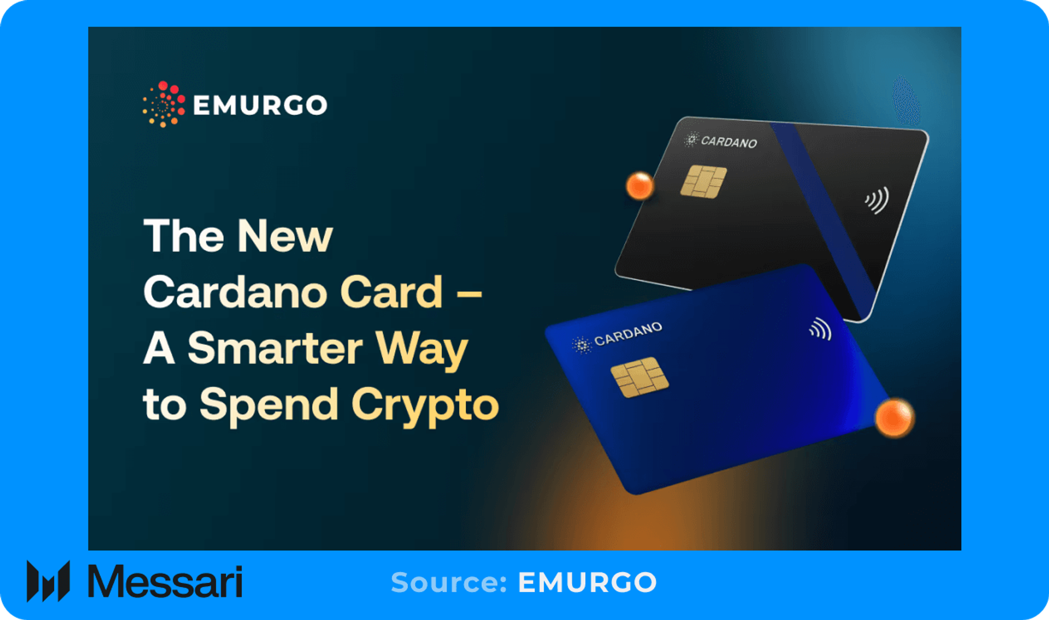 2025년 7월, 카르다노의 창립 주체인 에무르고는 디지털 자산을 일상 생활에서 사용 가능하게 만들도록 설계된 암호화폐 결제 제품인 카르다노 카드 등록을 시작했다. 카드는 온체인 금융의 올인원 키로 기능하여 사용자가 단일 플랫폼에서 직접 지출, 스테이킹, 차입, 보상 획득을 할 수 있게 한다.