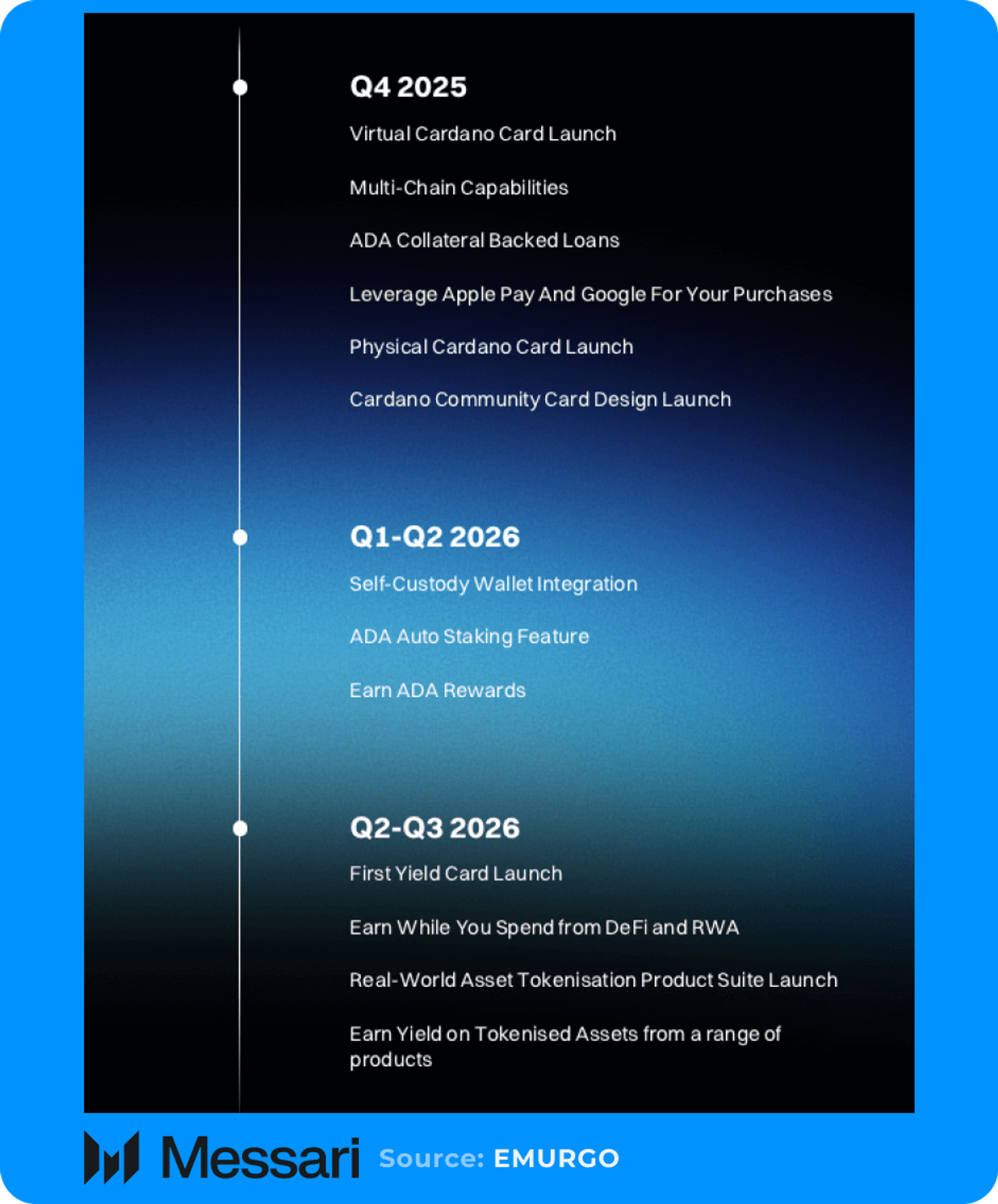 제품 로드맵은 가상 및 실물 카드 출시, 멀티체인 기능, ADA 기반 대출, 애플페이(Apple Pay) 및 구글페이(Google Pay) 지원을 포함하는 2025년 4분기 롤아웃을 목표로 한다. 2026년 중반까지 에무르고는 자체 보관 지갑 통합, 자동 스테이킹, 디파이 및 토큰화된 실물자산(RWA)과 연계된 수익률 카드 기능을 추가할 계획이다.