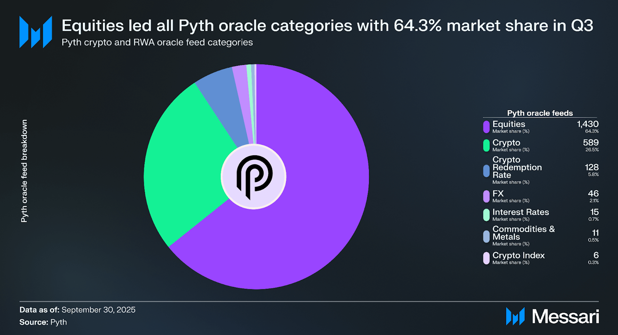 9월 30일 기준으로 주식은 1,430개 목록으로 모든 활성 가격 피드의 64.3%를 차지했다. 암호화폐가 589개 피드로 26.5%를 차지하며 그 뒤를 이었고, 암호화폐 상환율 피드가 128개로 5.8%를 차지하며 3위를 기록했다. 주식과 상환 상품에 피드가 집중되어 있는 것은 전통적인 금융 데이터에 대한 수요 증가와 전통 시장과의 더 깊은 통합을 시사한다.