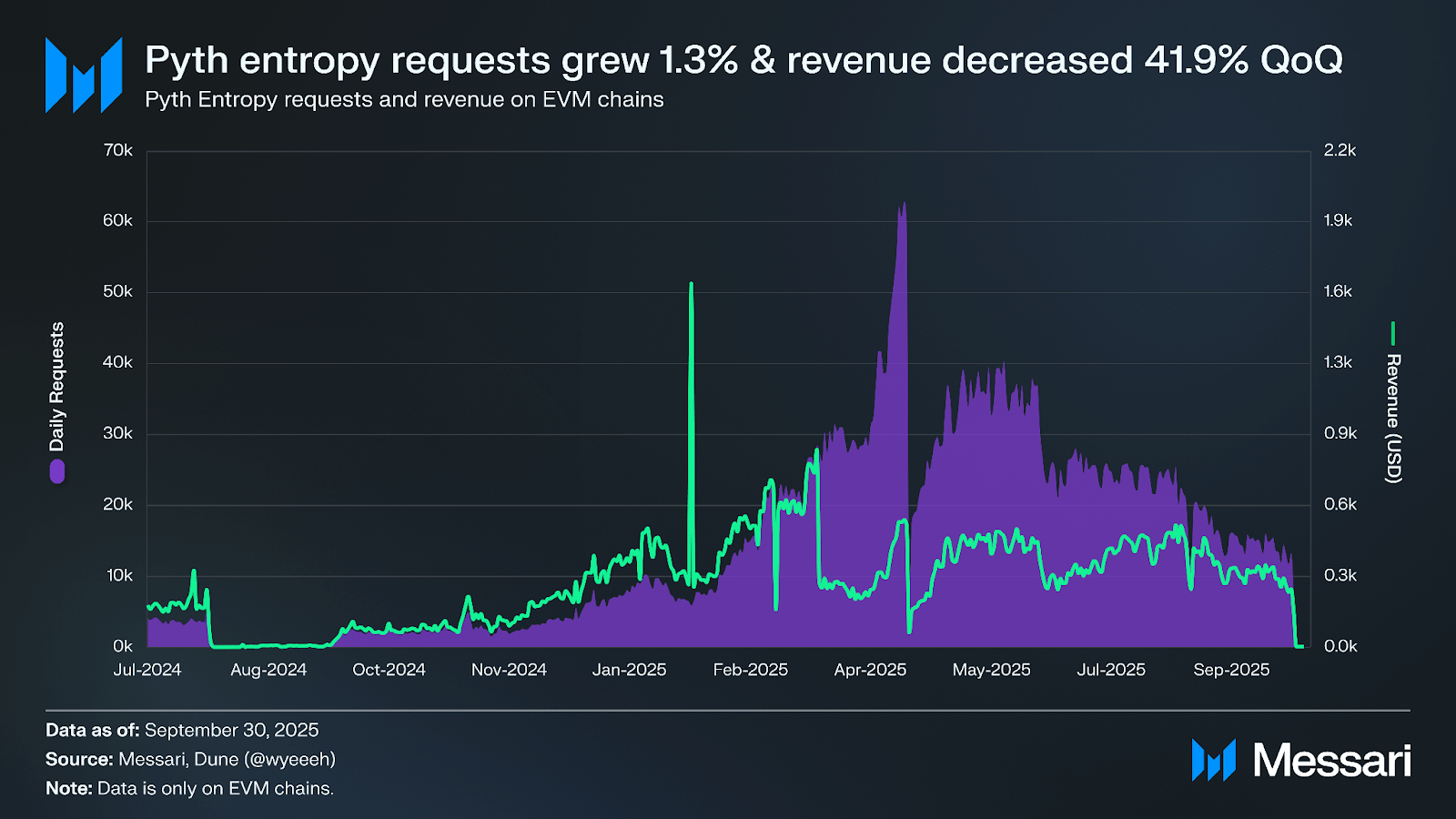 • 3분기에 엔트로피(Entropy)는 EVM 체인에서 422만 건의 무작위성 요청을 처리했으며, 이는 417만 건에서 전분기 대비 1.3% 증가한 것이다. 엔트로피 수익은 32,000달러에서 33,800달러로 5.7% 증가했다.