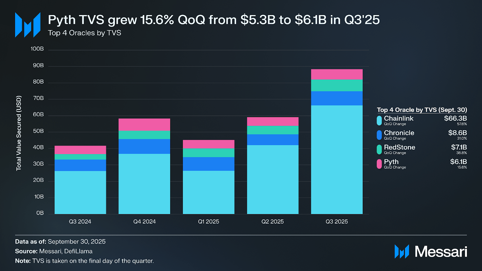 • 피스(Pyth)의 총 보안 가치(TVS)는 전분기 대비 15.6% 증가하여 2분기 말 53억 1,000만 달러에서 3분기 말 61억 4,000만 달러에 도달했으며, 이는 2분기 연속 성장이다.