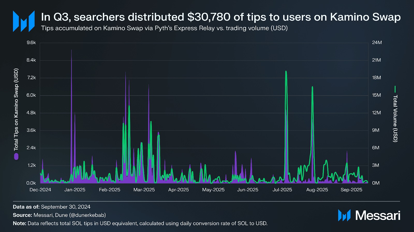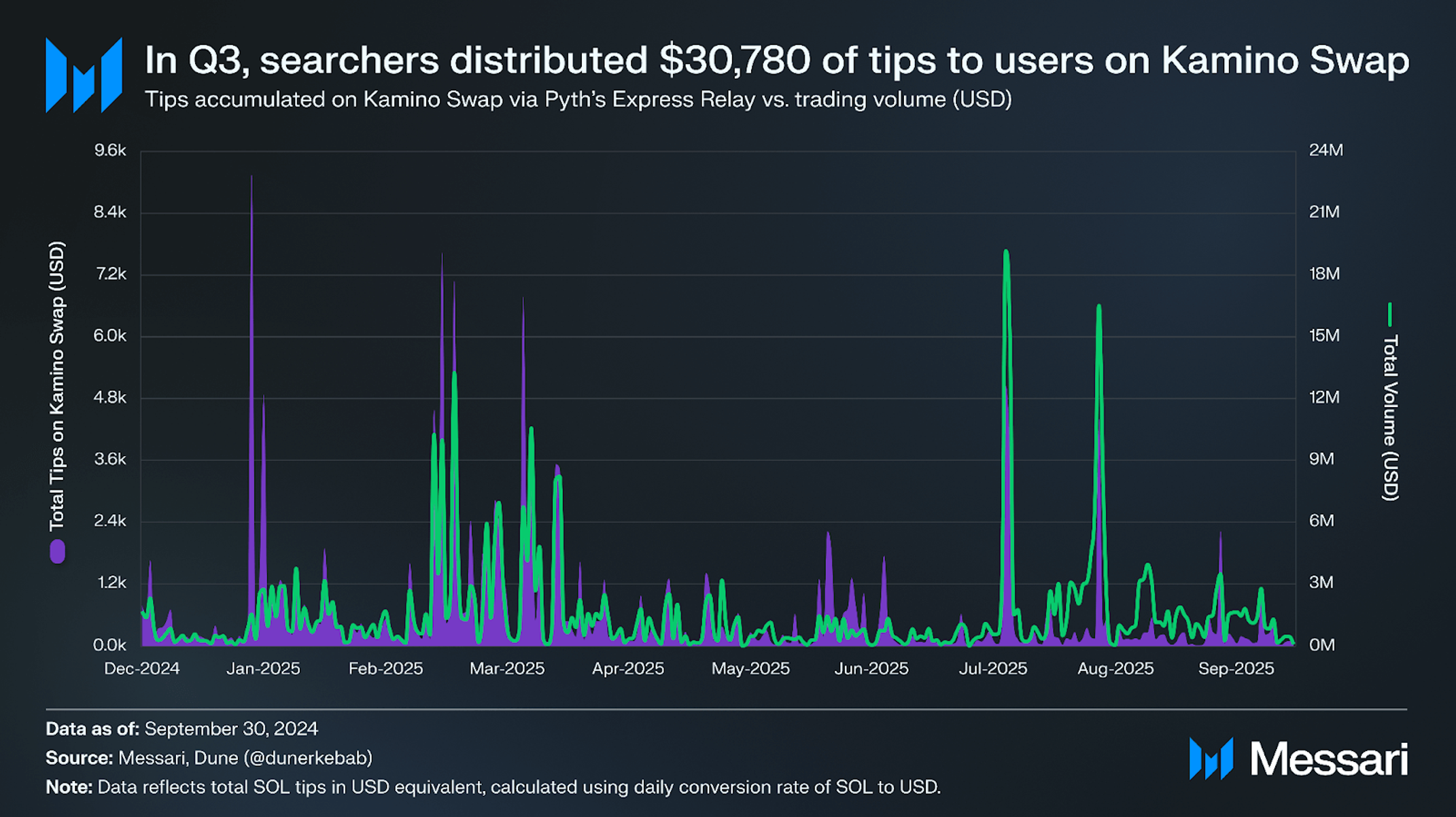 거래량 증가가 주문 수 성장을 앞질렀으며, 이는 사용자가 평균적으로 더 큰 거래를 실행했음을 나타내며, 이는 고가치 트레이더의 참여 증가 또는 더 큰 주문의 더 빈번한 실행을 반영한다. 지불된 총 팁의 감소에도 불구하고 익스프레스 릴레이는 높은 거래량과 평균 주문 규모를 유지했으며, 이는 실행을 개선하고 사용자에게 가치를 반환하는 역할을 강조한다.