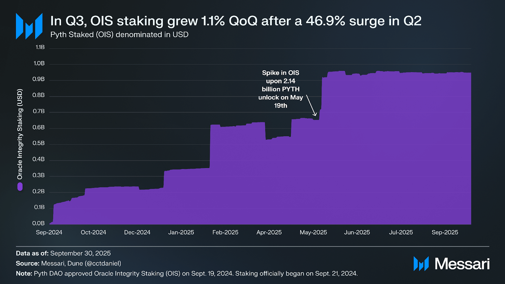 9월 30일 기준으로 OIS에 스테이킹된 총 PYTH는 9억 4,850만에 도달했으며, 이는 2분기 말 9억 3,800만에서 전분기 대비 1.1% 증가한 것이다. 이 증가는 5월 19일 토큰 언락이 21억 PYTH를 유통으로 출시하고 스테이킹 활동의 급격한 상승을 주도한 2분기 46.9% 급증에 이은 것이다. 3분기의 느린 성장은 5월 토큰 언락으로 주도된 2분기 급증 이후 스테이킹 참여가 안정화되었음을 나타낸다.