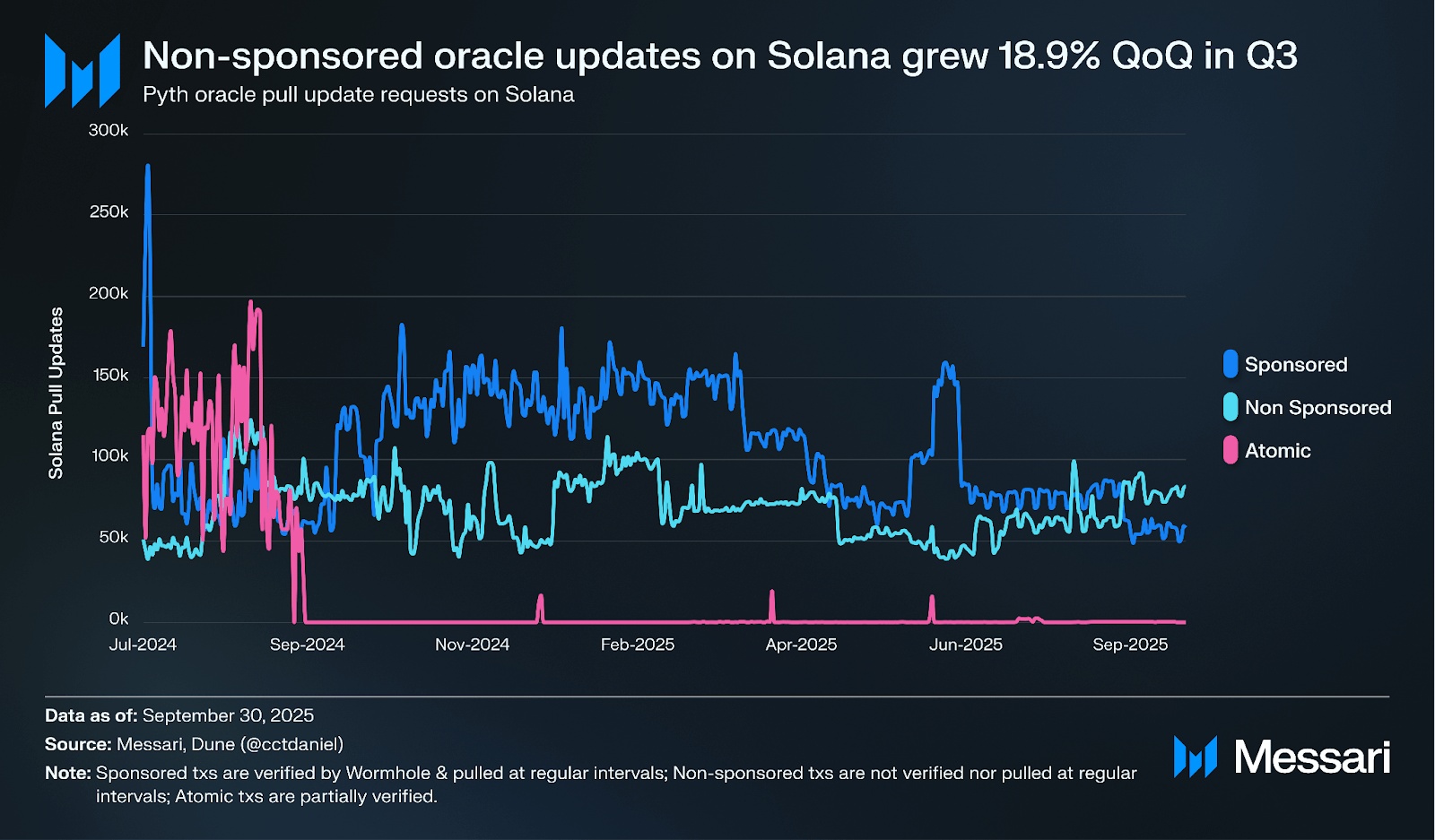 3분기에 피스는 솔라나에서 660만 건의 후원 업데이트를 처리했으며, 이는 2분기 880만 건에서 25.2% 감소한 것이다. 비후원 업데이트는 전분기 대비 18.9% 증가하여 530만 건에서 630만 건으로 상승했으며, 아토믹 업데이트는 전분기 대비 30.4% 감소하여 39,600건에서 27,600건으로 줄었다. 예정되고 검증된 업데이트의 감소와 수동 온디맨드 요청의 성장은 프로토콜이 비후원 거래로 전환하고 있음을 보여준다. 2025년 9월은 2024년 9월 이후 처음으로 일일 비후원 업데이트가 4일 연속 후원 업데이트를 초과했으며, 이는 사전 정의된 예정된 요청보다 일회성 거래 트리거 가격 업데이트에 대한 수요 증가를 반영한다.
