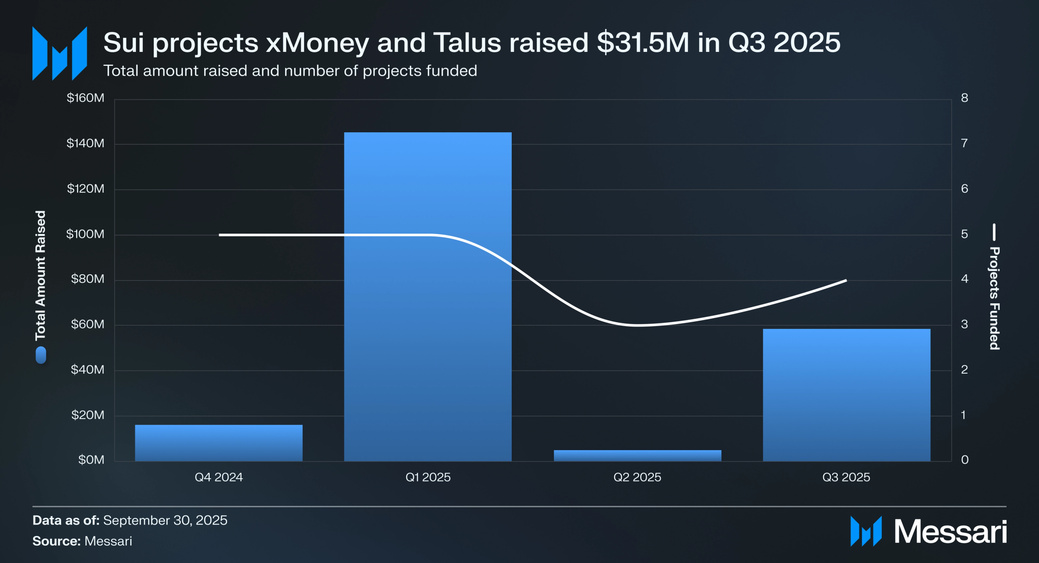 2025년 3분기에 수이와 수이를 기반으로 구축된 세 개의 프로젝트가 총 5,850만 달러를 조달한 펀딩 라운드를 발표했으며, 이는 2025년 2분기에 조달된 500만 달러에 비해 증가한 수치다. 3분기에 자금을 조달한 세 개의 프로젝트는 xMoney, OVERTAKE, 탈러스이며, 수이 재단이 모든 라운드에 참여했다.