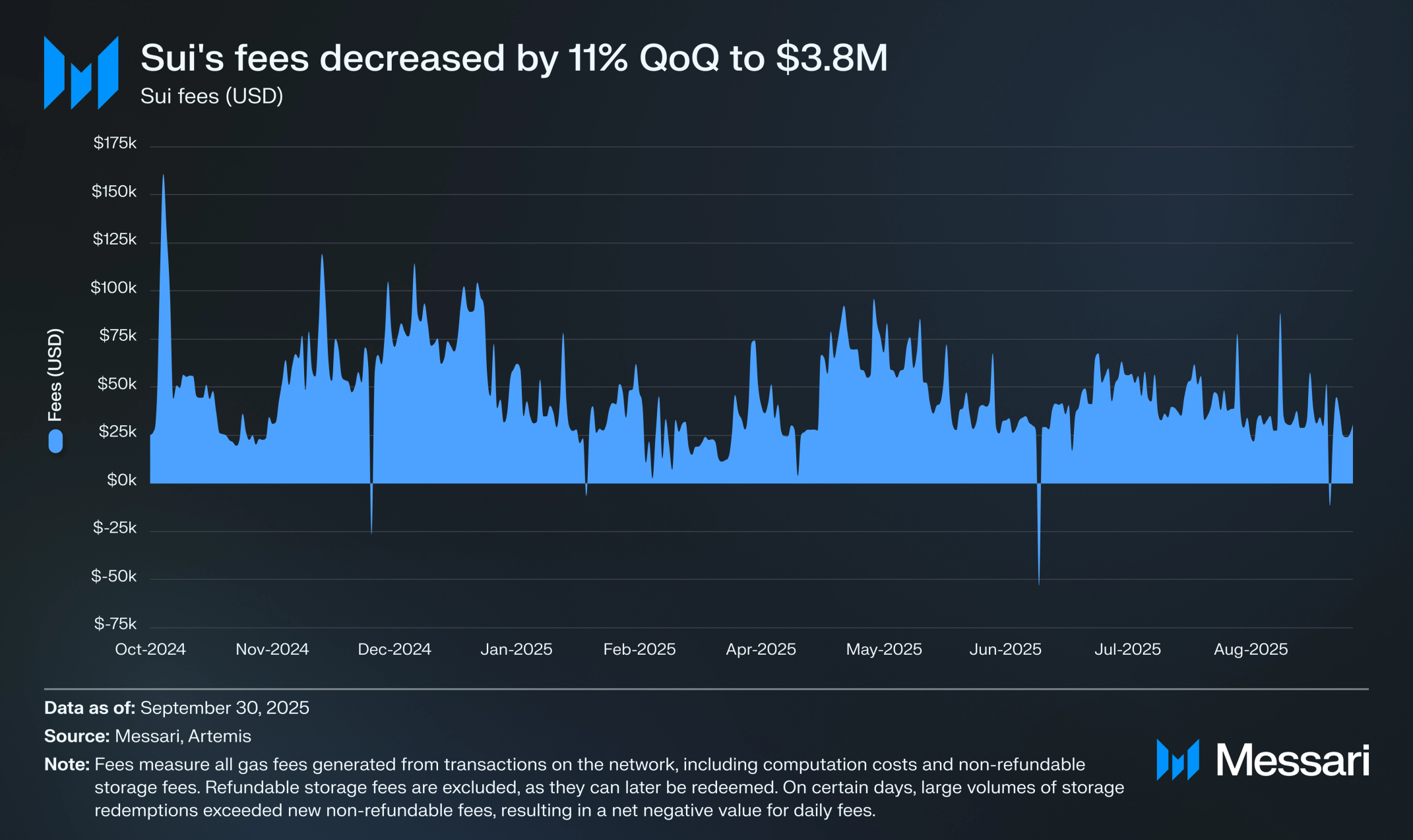 수이의 수수료는 컴퓨팅 비용과 환불 불가능한 스토리지 수수료로 구성된 네트워크의 거래에서 생성된 모든 가스 수수료를 포함한다. 이러한 수수료는 이후 네트워크 검증자에게 분배된다. 2025년 3분기에 총 수수료는 전분기 대비 11.1% 감소한 380만 달러를 기록했다.