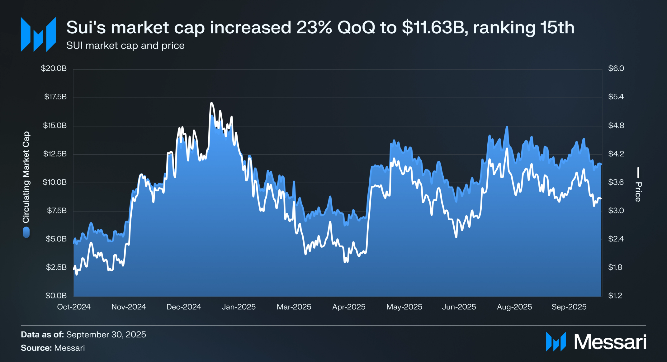 2025년 3분기에 SUI의 유통 시가총액은 전분기 대비 23.3% 증가한 116억 3,000만 달러를 기록하며, 같은 기간 20.7% 상승한 광범위한 암호화폐 시장을 능가했다. 3분기 말까지 수이는 2025년 2분기에서 3계단 하락하여 시가총액 기준 15위 암호화폐로 자리매김했다.