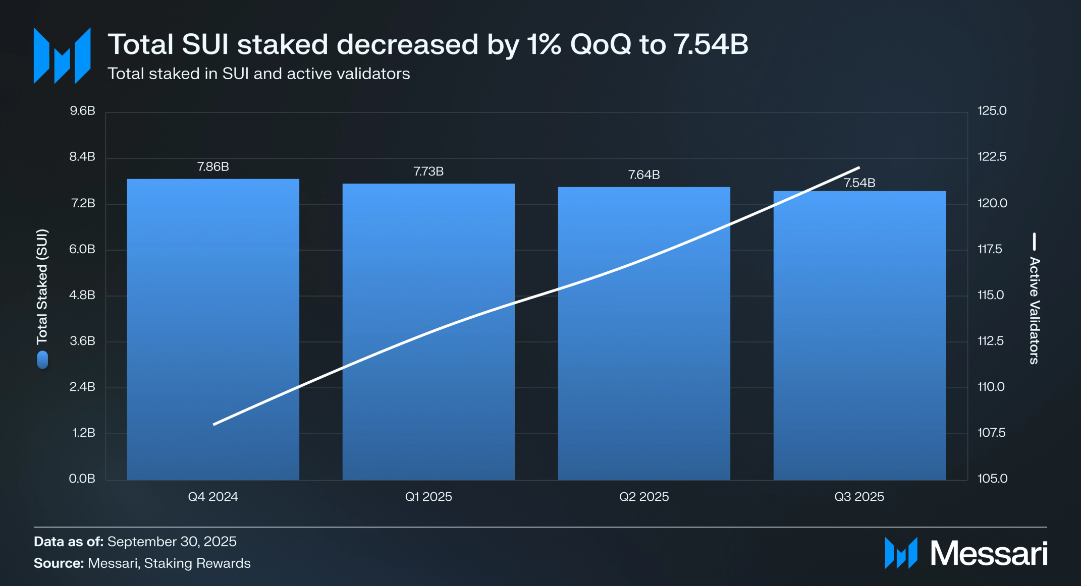 스테이킹된 SUI의 총량은 3분기에 소폭 감소하여 전분기 대비 1.3% 감소한 75억 4,000만 개(적격 공급량의 75.4%)를 기록했다. 그러나 분기 동안 SUI의 가격 상승으로 인해 스테이킹된 SUI의 달러 가치는 전분기 대비 15.8% 증가한 245억 8,000만 달러를 기록했다.