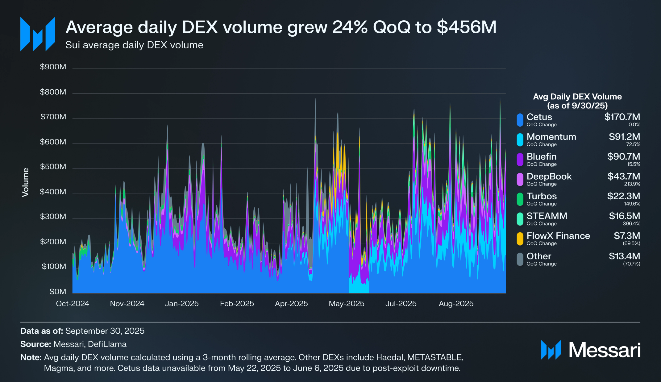 수이의 평균 일일 DEX 거래량은 3분기에 사상 최고치인 4억 5,600만 달러를 기록했으며, 전분기 대비 24.0% 증가했다. 세투스와 모멘텀이 각각 평균 일일 DEX 거래량 1억 7,070만 달러와 9,120만 달러로 선두를 차지했다. 거래량 기준 다른 상위 DEX로는 블루핀(Bluefin, 9,070만 달러), 딥북(4,370만 달러), 터보스(Turbos, 2,230만 달러), STEAMM(1,650만 달러), 플로우X 파이낸스(FlowX Finance, 730만 달러)가 있다.