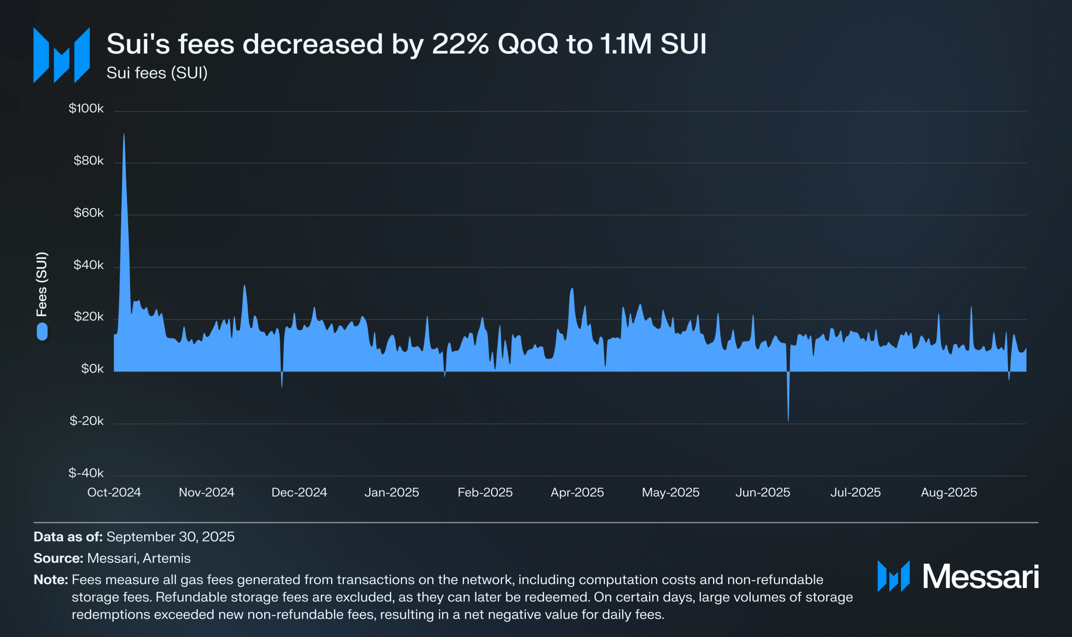 SUI로 표시된 총 수수료는 전분기 대비 22.3% 감소한 110만 SUI를 기록했다. 분기 동안 가격 상승에도 불구하고 SUI 표시 수수료의 감소는 네트워크 활동 및 거래 수요의 둔화에 기인할 수 있다.