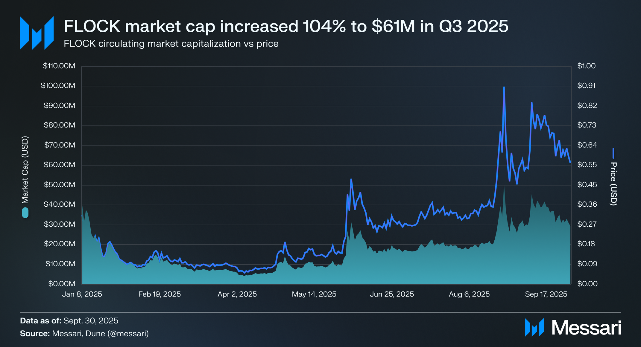 FLOCK의 시가총액은 3분기에 스테이킹 보상, 생태계 인센티브 및 예정된 토큰 릴리스로 인한 유통 공급량 증가로 가격을 능가했다. FLOCK의 유통 시가총액은 2025년 3분기에 103.6% 증가하여 3,010만 달러에서 6,120만 달러로 상승했으며, 가격은 0.15달러에서 0.27달러로 72.5% 상승했다. 시장 확대, 가격 및 거래량은 Coinbase와 Upbit의 주요 거래소 상장 이후 상당한 상승을 경험했다. 8월 21일 Coinbase 발표는 FLOCK 가격의 36.84% 급등을 일으켰고, 9월 9일 공식 상장 시 FLOCK 가격은 0.67달러의 정점에 도달했다. 이러한 주요 거래소 상장은 Coinbase와 Upbit가 합산 약 1억 2,000만 명의 검증된 사용자를 보유하고 있기 때문에 FLOCK의 주목할 만한 약 30억 달러(전분기 대비 230.7% 증가)의 거래량에 큰 촉매제가 되었을 가능성이 크다.