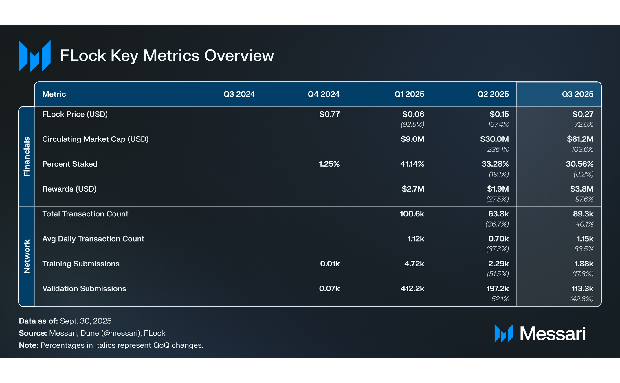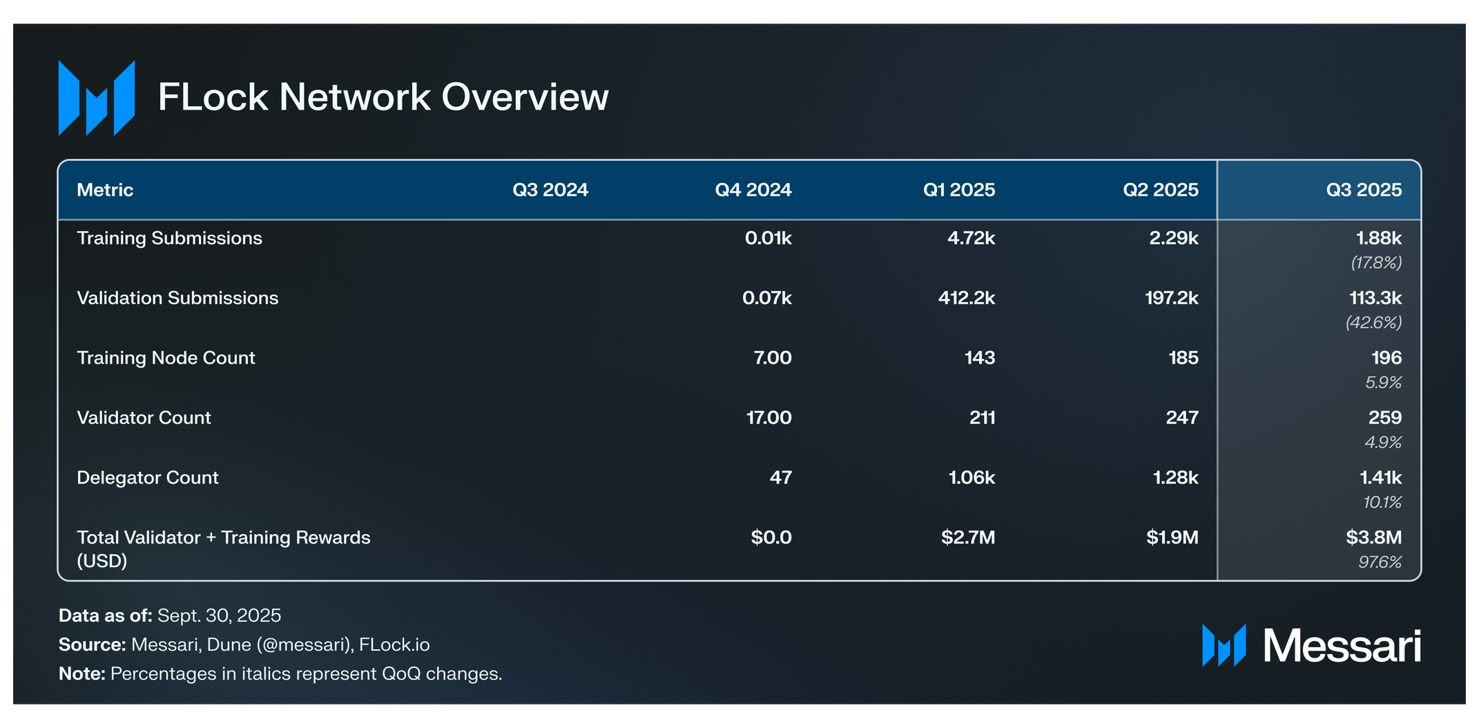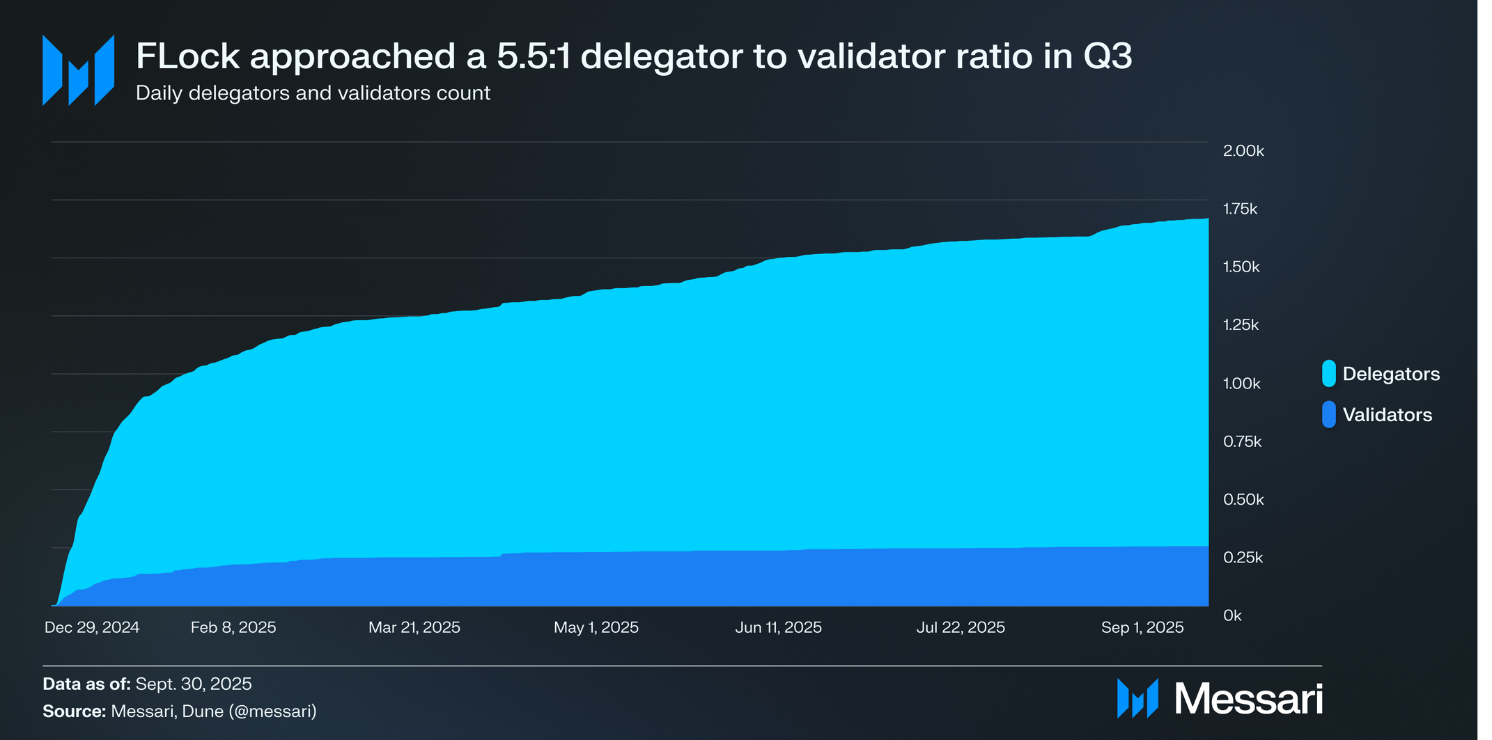 검증자 및 위임자 참여의 증가가 제출의 상응하는 증가 없이 발생하여 수익률 감소로 이어졌다. 제출률 감소에도 불구하고 검증자 및 위임자 참여는 3분기에 상승 추세를 이어갔다. 검증자 수는 2분기의 17.1% 증가와 비교하여 4.9% 증가한 259명을 기록했다. 위임자는 2분기의 20.7% 증가와 비교하여 10.1% 증가한 1,412명을 기록했다. 위임자 대 검증자 비율은 이전 분기의 5.2:1에서 5.5:1로 증가하여 위임이 토큰 보유자에게 선호되는 참여 형태로 남아 있음을 강조한다. Flock의 지표는 2025년 3분기 내내 건강한 성장을 보여주었으며, 커뮤니티 참여, 개발자 채택 및 생태계 파트너십 확대가 장기적인 지속 가능성을 지원했다.