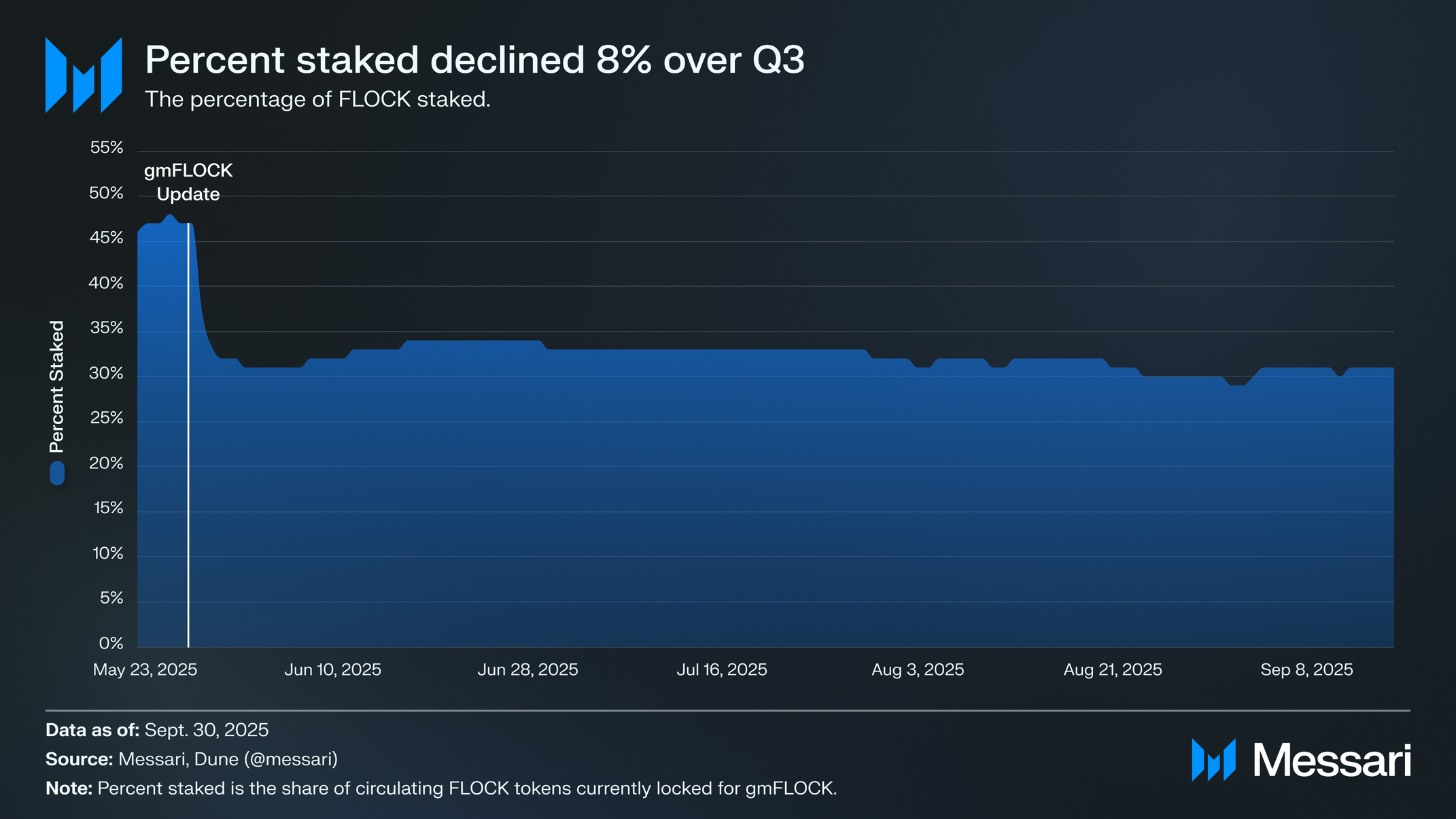 스테이킹 비율은 3분기에 계속 하락 추세를 보이며 스테이킹된 FLOCK가 33.3%에서 30.6%로 감소했다. 이러한 감소에 기여했을 수 있는 또 다른 요소는 FLOCK 가격의 전분기 대비 72.5% 증가인데, 일부 스테이커가 최근 언락된 FLOCK를 재스테이킹하는 대신 이익을 실현했을 가능성이 크기 때문이다.