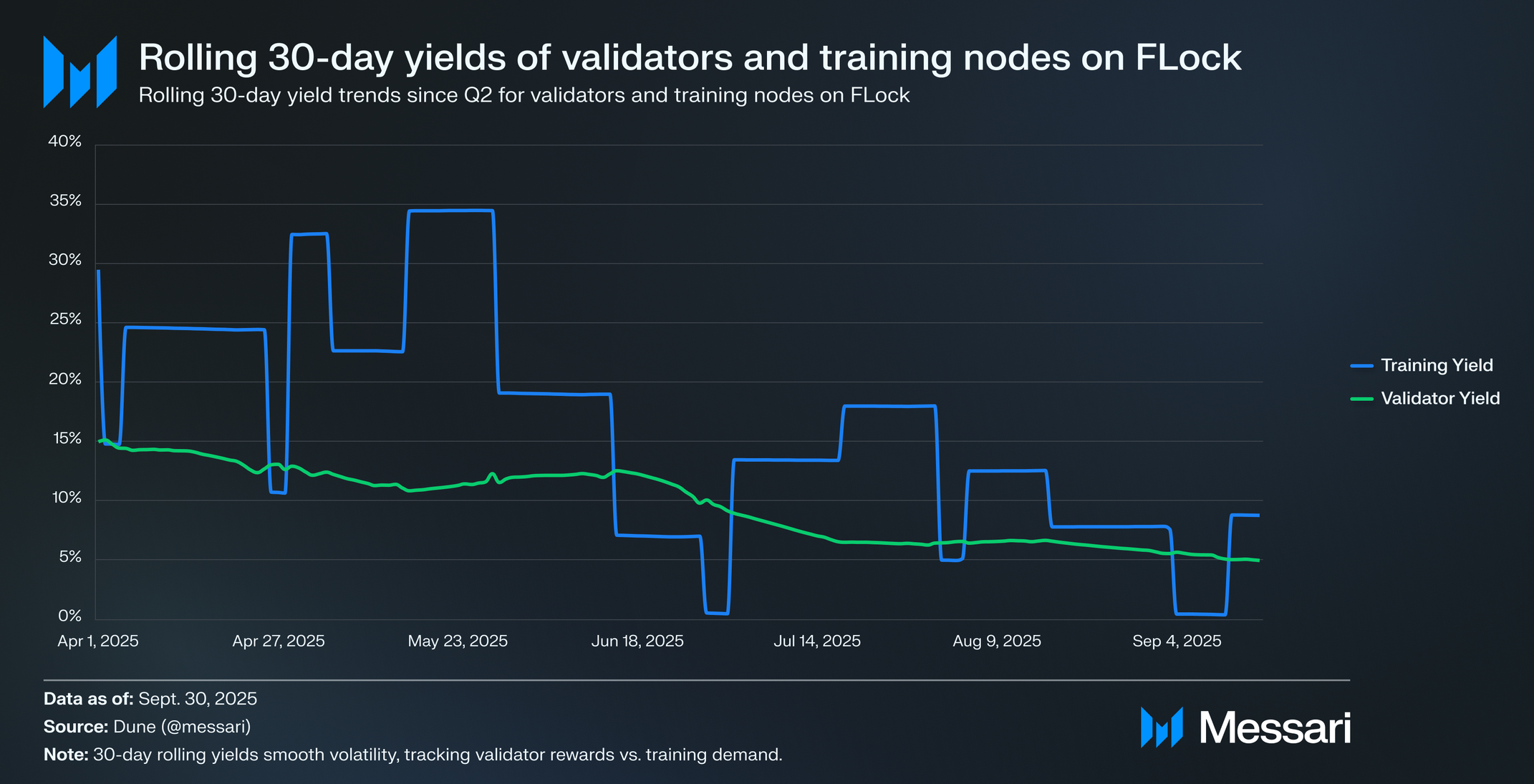 30일 롤링 수익률은 지난 30일 동안 훈련 노드와 검증자의 평균 보상을 측정하며, 단기 변동을 완화하여 인센티브 추세를 보여준다. 2분기에 훈련 수익률은 2025년 4월 28일의 최저 10.6%에서 2025년 5월 26일의 최고 34.5%까지 범위를 보였다. 검증자 수익률은 15.1%의 최고치에서 분기 말까지 9.7%의 최저치로 점차 감소했다. 3분기에 훈련 수익률은 2025년 9월 10일의 최저 0.4%와 2025년 7월 22일의 최고 18.0%로 넓은 범위를 유지했다. 검증자 수익률은 9.7%에서 분기 말까지 5.0%로 계속 점차 감소했다.