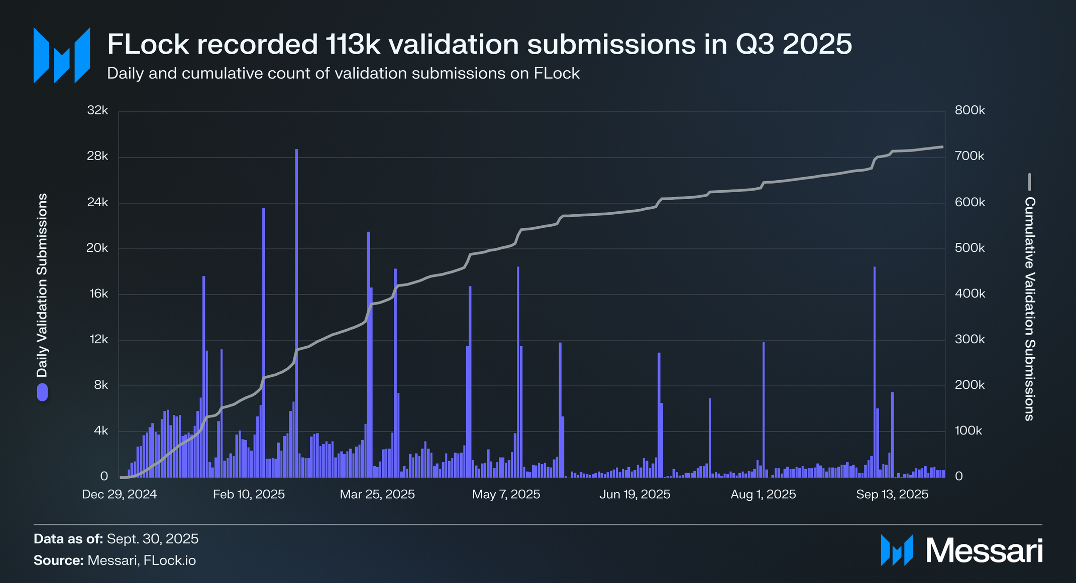 FLock의 검증 제출은 전분기 대비 42.6% 감소하여 2025년 3분기에 113,290건의 제출을 기록했다. 일일 제출은 아직 2025년 1분기의 약 2만 9,000건의 사상 최고치를 넘어서지 못했지만 지속적인 참여를 보이고 있다. 데이터의 비정상적인 급증은 UNDP accelerator 해커톤 결승 기간인 2025년 9월 7일의 3분기 최고치인 18,421건의 제출, 그리고 QWEN x Alibaba Hackathon 기간인 2025년 8월 1일의 11,862건의 제출과 같은 이벤트와 관련이 있다. 2025년 9월 30일 기준, 누적 722,782건의 검증 제출이 있었다.